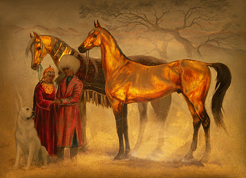 弗多斯基諾微型漆畫在混凝紙漿制成的日常用品上完成,例如:首飾匣、小盒子、鼻煙壺、相冊封面或其他物品——在俄羅斯及世界各國均享有盛名。弗多斯基諾微型漆畫不僅是傳統(tǒng)的民族手工藝,同時也是一門真正的藝術(shù)。 弗多斯基諾微型漆畫的獨特技術(shù)采用的是一種“透亮畫法”,在漆器表面進行繪飾之前,涂上一層由金箔或珍珠貝制成的反光材料——金屬粉末。透過清漆,與漆器的黑色底面形成強烈反差,從而增強圖案亮度。同時,背景能夠增強畫面的深度和發(fā)光效果。 畫家娜塔莉亞·列昂諾娃(1956 年生)采用該技術(shù)在小匣子上完成了這幅《土庫曼旋律》的原創(chuàng)作品,她的作品由于其特殊的馬類主題在傳統(tǒng)弗多斯基諾微型漆畫中享有盛名。馬類主題的畫作形成了一場藝術(shù)風暴,許多人評價它們是傳統(tǒng)的民族創(chuàng)作,也常被作為國禮贈送給其他國家的政府首腦。列昂諾娃本人是一個狂熱的馬術(shù)愛好者和阿哈爾捷金馬的崇拜者。作品得到畫家娜塔莉亞·列昂諾娃授權(quán),文章摘錄自《阿哈爾捷金馬》雜志信息專欄。 在俄羅斯的華沙展覽廳,著名畫家阿列克謝·格魯哈羅夫的典型風格作品受到追捧,他的畫展是一次創(chuàng)造性的回顧,能夠推動繪畫技巧的發(fā)展,將繪畫題材拓寬至馬的各個方面。但有一點從未改變,阿列克謝創(chuàng)作的主題一直是阿哈爾捷金馬,從第一次接觸就注定永久性地俘獲了他的靈魂。 這次展會上,增加的兩幅新作品突出表達了畫家的觀點:阿哈爾捷金馬有兩個起源,男人和女人;兩個本質(zhì),天馬和塵世之馬。油畫《土庫曼少年與金馬》描繪了年輕人昂首挺胸地向前走去,手中牽著的是同樣步伐堅定的金馬。另一幅畫《塞壬與寶馬》中,金色天馬優(yōu)雅地飛翔在雪山頂峰。阿列克謝對馬的熱情不僅通過每一幅作品去表達,連他創(chuàng)作的詩句中也不乏對馬的贊美,他奔騰的想象力在詩句中緩緩流淌,將馬塑造成他心目中的美好形象。 |