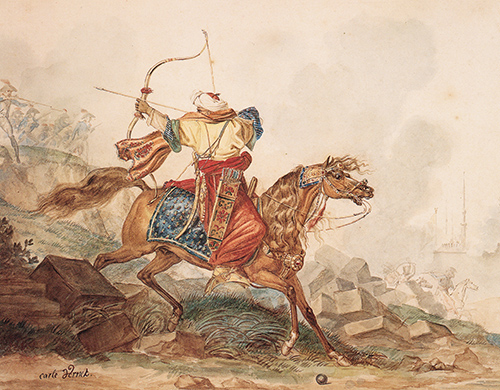 卡爾勒·韋爾內(nèi)(1758-1836) 開弓射箭的馬穆魯克騎兵,水彩畫。 現(xiàn)由美國弗吉尼亞州阿珀維爾的保羅·梅隆夫婦私人收藏 卡爾勒·韋爾內(nèi)出生在法國波爾多的一個藝術(shù)世家,他的爸爸約瑟夫·克勞德·韋爾內(nèi)是早期著名的油畫大師。卡爾勒·韋爾內(nèi)延續(xù)了家族的藝術(shù)基因,子承父業(yè),并青出于藍而勝于藍,年僅 24 歲便贏得法國國家藝術(shù)獎學(xué)金“羅馬大獎”,該獎項獲得者可以得到法國國王資助,前往藝術(shù)之都羅馬進行深造。他年輕時一度熱衷法國大革命,在每個靈感迸發(fā)的時刻,總是能創(chuàng)作出令世人稱贊的佳作。在革命后期,因其大氣磅礴的畫作風(fēng)格,他深得拿破侖賞識。直到1808年,50歲的韋爾內(nèi)被拿破侖授予“法國榮譽軍團勛章”,并在之后成為了國王路易十七的御用畫家。 韋爾內(nèi)還有另外一個身份——狂熱的馬術(shù)愛好者。他對馬術(shù)的這份熱情不停地通過筆下的畫作傳遞,他的作品里展現(xiàn)了馬匹在各種狀態(tài)下的颯爽英姿,諸如賽馬、狩獵或者戰(zhàn)爭中馬的肖像,畫面細膩而張揚,情緒渲染力極強。他藝術(shù)造詣極深,擅長油畫、水彩畫和石版畫。在后期的作品里,韋爾內(nèi)創(chuàng)作了大量展現(xiàn)當(dāng)時市井風(fēng)俗的版畫,描繪了彼時法國的馬匹交易市場以及人情百態(tài)。 這幅作品,為我們呈現(xiàn)了埃及馬穆魯克騎兵征戰(zhàn)沙場時的勇猛形象。馬穆魯克騎兵也稱奴隸兵,因其早期的騎兵大多是被奴隸販子強制販賣至中東地區(qū)后成為雇傭兵,由此而得名。到拿破侖時代,馬穆魯克騎兵隊逐漸發(fā)展為一支令人聞風(fēng)喪膽的軍隊,創(chuàng)立并鞏固了馬穆魯克貴族的統(tǒng)治地位。值得一提的是,所有的馬穆魯克騎兵都沒有結(jié)婚,他們擁有下一代的方式是通過有償購買俄羅斯南部農(nóng)民家庭的孩子來實現(xiàn)。他們培養(yǎng)這些孩子成為虔誠的伊斯蘭教徒,肩負著成為一名優(yōu)秀的騎兵且隨時為戰(zhàn)爭獻身的使命。就這樣,馬穆魯克的貴族時代,在埃及持續(xù)了五個半世紀,階級地位從未有過絲毫動搖。 再回到韋爾內(nèi)的畫作中來,馬穆魯克騎兵身著華麗服飾,與之相伴的戰(zhàn)馬也佩帶精致的頭飾及鞍飾,配合主人完成了獨特的撤退掩護戰(zhàn)術(shù)。據(jù)傳,被雇傭的馬穆魯克騎兵中有一部分塞西亞人,他們并肩作戰(zhàn),技藝高超,可在軍隊撤退時,以上身回轉(zhuǎn)的方式將弓箭高舉過肩膀,完成精準有力的一箭。韋爾內(nèi)用畫筆塑造的這位塞西亞奴隸兵微傾身體,正全力以赴攻擊后方的敵軍,他犀利的眼神,無疑是睿智和力量的象征。 |