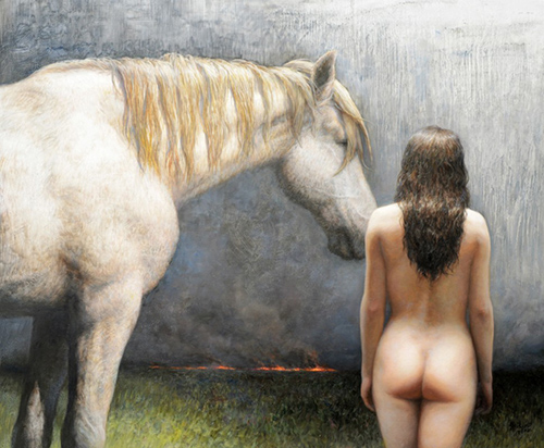 暗夜——《女人與馬》系列 UNDER THE NIGHT, WOMAN AND HORSE 趙大陸 《暗夜》 2008年作 布面油畫 100cm×120cm 2008年畫家在澳大利亞旅居期間常到牧場采風(fēng),作為藝術(shù)家亦是愛馬之人,細(xì)膩的人馬關(guān)系、人與自然的和諧皆帶給他無限靈感,進(jìn)而創(chuàng)作了《女人與馬》這一系列的作品。莊子所說“天地與我并生,而萬物與我為一”,正是畫家通過作品試圖傳遞的思想。 在這幅作品中,我們無法觀察到女人的表情,或許她正注視著遠(yuǎn)方燃燒的地平線,或許她正凝視著馬兒的雙眸;她的背影隱約透露出一絲憂慮,而身邊的白馬正溫柔地向她探過頭去。從構(gòu)圖來看,人的表現(xiàn)力更強(qiáng),馬匹的著色和筆觸則悄然令它融于背景之中。畫家用象征性的手法描述人類與馬匹的精神交流,而通常認(rèn)為的人處主動(dòng)、支配的地位似乎正被畫面的比重所顛覆——人與動(dòng)物均是自然界中的一個(gè)元素,同樣會(huì)對(duì)不確定的未來產(chǎn)生危機(jī)感。人與馬作為前置的主體結(jié)合到灰暗的天空與草地中,唯一的亮色卻來自遠(yuǎn)方令人擔(dān)憂火焰,柔和的人體和粗狂的馬同樣訴說著對(duì)自然的眷戀和熱愛,并在這樣的環(huán)境中相互慰藉著。 |
