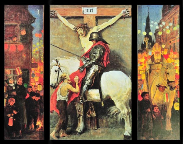 尤利烏斯·保羅·容漢斯(1876 - 1958 年) 圣馬丁三聯(lián)畫 1934 - 1936 年 創(chuàng)作 布面油畫 155×192 cm 私人收藏品 尤利烏斯·保羅·容漢斯是德國(guó)知名的動(dòng)物、風(fēng)景畫的領(lǐng)軍人物,由于其崇尚納粹政治,所以也被稱為納粹藝術(shù)家,是希特勒跟前的紅人。實(shí)際上,相比政治題材的作品,容漢斯更擅長(zhǎng)風(fēng)景畫、田園風(fēng)光和農(nóng)作場(chǎng)景,這些作品體現(xiàn)了工作的辛苦及對(duì)祖國(guó)的自豪之情。 而這幅三聯(lián)畫卻罕見(jiàn)地以宗教故事為題材,這位忠實(shí)于納粹黨的藝術(shù)家并未將任何德意志模式強(qiáng)加進(jìn)來(lái)。畫作中間描繪了圣馬丁將自己的斗篷一分為二,將一半分給一名乞丐的情景。兩側(cè)則描繪了圣馬丁節(jié)日的游行隊(duì)伍,直到今天,這仍是萊茵河地區(qū)的風(fēng)俗。在這幅畫作中,中央是一匹風(fēng)姿俊美的白馬,類似于法國(guó)的佩爾什馬。佩爾什馬屬于冷血重型馬,發(fā)源于法國(guó)諾曼底的拉佩什地區(qū),一些佩爾什馬引用過(guò)阿拉伯馬的血統(tǒng),這種馬吃苦耐勞,起初被廣泛用作戰(zhàn)馬,后逐漸擴(kuò)展為農(nóng)用馬和乘用馬。 在容漢斯的眾多作品中對(duì)于馬的描繪占據(jù)了其繪畫題材的較大比例,不管是在農(nóng)作工作中的馬、牧場(chǎng)上奔跑的馬還是和人在一起的馬,其形象都栩栩如生,充滿了靈動(dòng)感,也展現(xiàn)了德國(guó)鄉(xiāng)間恬適的田園生活。 |