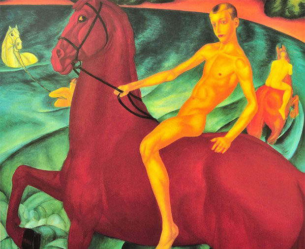 紅馬之浴【1912年】 古斯馬?佩特羅-沃德金 布面油畫:160×186cm 國立特列季亞科夫畫廊,莫斯科 圍繞這幅非凡的作品有許多不同的解釋與理解,但該作品中這匹巨大的赤兔馬所表現(xiàn)出來的壯觀的氣勢是無可爭議的。這也是觀賞者看到這幅巨大的布畫時的第一印象。特別是這匹赤兔馬所展示的熱烈、活潑的性格,所蘊含的精力,輕微轉(zhuǎn)向觀賞者的頭顱和它充滿魅力、生動的眼神非常吸引人。這幅畫是一幅真正具有吸引力的作品:它提出問題,卻沒有給出明確的答案。 佩特羅-沃德金的所有作品都展現(xiàn)了自然的精神。他不僅將宗教作為作品題材,而且也創(chuàng)作了大量以世俗內(nèi)容為主題的作品。但后者意義更深遠,并激發(fā)人們超越素材的反省及沉思。紅馬之浴這幅畫色彩層次變化非常明顯,先將位于畫面中心位置的馬兒著以明亮的鮮紅色,當它潛入象征精神的湖水中后淡為橙色,最后經(jīng)過宗教的洗滌之后則變?yōu)榘咨?/div> |