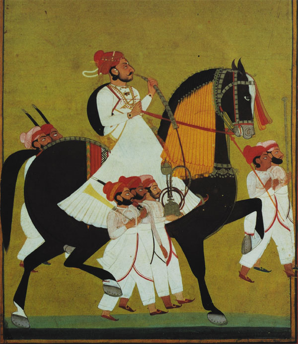 印度焦特布爾的昆巴沃特?凱薩里?辛格在仆傭環(huán)簇中叼著水煙騎馬出行 1810-1820年左右 紙面水粉畫 30.1cm×22 cm 倫敦,皇家亞洲協(xié)會(huì),托德收藏館 出色的駿馬前肢高抬,旁若無人的自滿態(tài)度與其背上高傲威嚴(yán)的昆巴沃特?凱薩里?辛格如出一轍。他坐在馬背上紋絲不動(dòng),吸著水煙,表現(xiàn)出貴族特有的冷漠與寬容。而他靜止不動(dòng)的坐姿則突出了坐騎所具有的巨大力量。那時(shí),貴族騎師按照非正式的禮節(jié)帶著隨從騎著駿馬出行的題材廣受歡迎。同時(shí),這類題材也突顯了他們的高大形象。 印度氣候復(fù)雜,草場條件不好,不適于養(yǎng)馬。盡管如此,印度仍出產(chǎn)了幾種值得關(guān)注的馬種,例如馬爾瓦爾馬。這種馬與眾不同,擁有典型的內(nèi)翻耳,深受印度西北部傳統(tǒng)統(tǒng)治者的喜愛,受到了幾乎與它們的貴族騎師同等的尊重。馬爾瓦爾馬大概源自非常普遍的蒙古矮種馬,是蒙古矮種馬與土庫曼斯坦的沙漠馬及里海地區(qū)的阿拉伯馬雜交的結(jié)果。 |