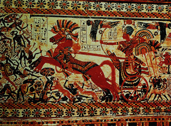 埃及 圖坦卡蒙駕戰(zhàn)車痛擊非洲人(局部) 公元前1567-1320年左右; 木制,彩繪 ;開(kāi)羅,埃及國(guó)家博物館 這幅描繪年輕的法老王圖坦卡蒙(約公元前1370-1352年)狩獵非洲人的圖畫與其它幾幅屬于一個(gè)裝飾華麗的木箱表面的裝飾畫。該木箱是在圖坦卡蒙的墓中發(fā)掘出來(lái)的一件珍寶。發(fā)現(xiàn)時(shí)木箱表面五彩繽紛,色澤鮮亮,雖歷經(jīng)萬(wàn)年仍保存完好,令人驚嘆。 畫面中,年輕的法老王站在由兩匹充滿力量與激情的駿馬所牽引的戰(zhàn)車中,一匹栗色露牙,另一匹則是棕色。這兩匹阿拉伯種馬飛奔向前,高高躍起,避開(kāi)跌倒在地的敵人,攻擊狂野有力,與主人勇敢無(wú)畏的脾性相映生輝。而圖坦卡蒙則將韁繩纏繞在自己的腰間,空出兩手張弓瞄準(zhǔn)敵人。 不久前,人們開(kāi)始置疑有關(guān)圖坦卡蒙死于謀殺的說(shuō)法,并提出另一種假設(shè),他有可能是從戰(zhàn)車上摔下致死。無(wú)論如何,將韁繩纏繞在自己的腰間是一種很危險(xiǎn)的做法,極其容易導(dǎo)致發(fā)生意外。 |
