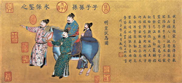 琺瑯瓷版畫(huà)《明皇試馬圖》根據(jù)清乾隆黑漆描金《明皇試馬圖》掛屏(清宮舊藏現(xiàn)存于故宮博物院)所制作,原作為唐代畫(huà)家韓干所畫(huà),作品中的人物形象及馬的神態(tài)刻畫(huà)的惟妙惟肖、入木三分、猶如神來(lái)之筆。 畫(huà)家在《明皇試馬圖》中呈現(xiàn)的是唐玄宗的御馬,高大健壯,鬃毛整齊,腰肥雄俊,唐韻十足,坐在馬背上的是皇帝李隆基,又稱唐明皇,身穿便服,風(fēng)度翩翩,左右二人扶持,身后一隨從緊跟,畫(huà)面中顯示出唐明皇的大氣和富貴,此作品為韓干的精品之一。清代著名的收藏寶典“石渠寶笈”上都有注錄。 畫(huà)面左方有乾隆皇帝一百多字的御題詩(shī):“我曾見(jiàn)趙霖六馬傳貞觀……?!蔽熳有麓呵〉塾H筆御書(shū)。 此《明皇試馬圖》將原跡上的十多方歷代印記一一仿制,如“ 鑑古”、“天子古希”、“乾隆御筆之寶”、“石渠寶笈”、“三希堂精鑑”等。這樣更增加了這件藏品的珍貴。 琺瑯瓷板畫(huà)又稱瓷畫(huà),是從中國(guó)傳統(tǒng)瓷器基礎(chǔ)上演變而來(lái),最初瓷器只是為了滿足實(shí)用,到了唐代逐漸向裝飾方向發(fā)展,明代中葉前主要是以青花為主,西方琺瑯傳入中國(guó)后,于是就增加了斗彩和五彩。瓷板畫(huà)它既繼承了中國(guó)繪畫(huà)的精華,又能隨心所欲地表現(xiàn)各種繪畫(huà)流派的藝術(shù)風(fēng)格,是繪畫(huà)藝術(shù)和燒瓷藝術(shù)的巧妙結(jié)合,二者缺一不可。 琺瑯瓷板畫(huà)工藝流程復(fù)雜,每道工序的細(xì)膩程度要求之高是其它工藝生產(chǎn)難度無(wú)法比擬的。從材質(zhì)的選擇,乳香油的提煉,顏料的調(diào)劑,毛筆的處理方法至繪制的具體步驟和技法都十分嚴(yán)謹(jǐn)細(xì)致,這些生產(chǎn)技能是難以為現(xiàn)代技術(shù)所替代。 琺瑯瓷板畫(huà)從明至清延續(xù)至今,雖然不到200年歷史,長(zhǎng)期以來(lái)作為一種主要的文化載體,為中華文明及世界文明的延續(xù)發(fā)揮了巨大的作用。瓷板畫(huà)有“瓷畫(huà)百年”的美譽(yù),具有濃厚的文化元素和民族風(fēng)格,給人以強(qiáng)烈的藝術(shù)感受,越來(lái)越受到海內(nèi)外的一些藏家和瓷板畫(huà)愛(ài)好者的喜愛(ài)和珍藏。特別是當(dāng)代名家精心繪制的歷代國(guó)家級(jí)傳世之作,更是得到眾多收藏家的爭(zhēng)相收購(gòu)。因?yàn)轫n干是盛唐著名繪畫(huà)大家,他以畫(huà)牛、馬等動(dòng)物畫(huà)著稱于世?,F(xiàn)流傳在世的作品已經(jīng)非常稀少,大部分珍跡都已失傳。為此乾隆帝當(dāng)時(shí)將韓干的不少繪畫(huà)珍品,由宮廷著名畫(huà)師復(fù)制到優(yōu)質(zhì)瓷板上,經(jīng)過(guò)特殊的瓷窯燒制而成,成為現(xiàn)在這種既珍貴又稀少的宮廷琺瑯瓷板畫(huà)。后經(jīng)著名文物鑒定專家孫學(xué)海老先生的鑒定,認(rèn)可此件琺瑯瓷板畫(huà)《明皇試馬圖》為清末舊藏,極為珍貴,具有很高的觀賞和收藏價(jià)值。 |