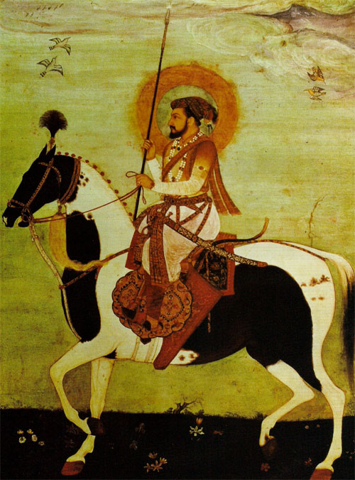 沙賈漢騎馬圖,出自沙賈漢紀念冊 沙賈漢時代(執(zhí)政時期:1628-1658年) 紙面彩墨和金箔畫,38.9×25.7cm;紐約.大都會博物館 這幅沙賈漢的肖像畫無比優(yōu)美。畫中的黑色花斑馬黑白相間,體型輕盈,威嚴十足,穿金戴銀,帶著鑲有華麗的裝飾品的馬鞍、籠頭。這才配得上這位儀表堂堂的騎師。 這匹駿馬斑紋獨特,易于辨認。幾種不同的小裝飾畫上都繪有沙賈漢(以建造泰姬陵而聞名天下)乘騎它的形象。其中一幅繪有1635年,沙賈漢的三個幼子沙舒加、奧朗則布和穆拉德巴克什中的一個乘騎它的形象。這匹駿馬經常出現,意味著它被這個家族視為珍寶??梢圆聹y,它也是這個地區(qū)最好的駿馬之一。這匹出色的駿馬很有可能是卡提阿瓦馬。這一品種的馬深受喜愛,大約起源于莫臥爾皇朝時代(1536 -1857年)。這種馬以其耳朵可以靈活彎曲,耐力突出而出名。這種馬向來由王公貴族培育,往往作為家畜飼養(yǎng)。直到今天,這一品種的馬在其原產地古吉拉特邦仍廣受重視與追求,現主要用于警方騎乘。 |