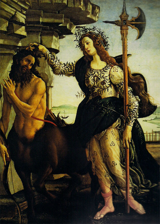 桑德羅·波提切利(1444/1445年-1510年),《帕拉斯與肯陶洛斯》1485年左右 蛋黃涂料,木制油畫207×148 cm佛羅倫薩,烏菲茲美術館 提到有關肯陶洛斯族馬人的神話傳說,人們馬上就會想到不騎馬文化中的騎士。早期的游牧民族往往被描述為暴戾好斗,這種個性正好解釋了起初肯陶洛斯族馬人為什么總是被冠以野蠻的名聲。盡人皆知,肯陶洛斯族馬人野蠻、貪婪、狂放不羈且非??膳?。而馬人喀戎和福洛斯則性格平和,是馬人一族中的異類。 這幅作品深得波提切利自己的喜愛。他描繪了馬人與女神米諾娃(即雅典娜)在一起的形象,從畫中的馬人身上看不到一絲貪婪之氣。反之,這個半人半獸顯得十分溫柔、馴服,寓意智慧(米諾娃的象征意義)戰(zhàn)勝了野蠻。 這幅作品和波提切利另一幅著名的《春》創(chuàng)作于同一時期,也曾懸掛在洛倫佐·德·美第奇位于佛羅倫薩的別墅中。畫中米諾娃的衣服上纏繞著類似美第奇家族族徽圖案的裝飾物。她的原型很有可能是美第奇家族的一位成員。 |