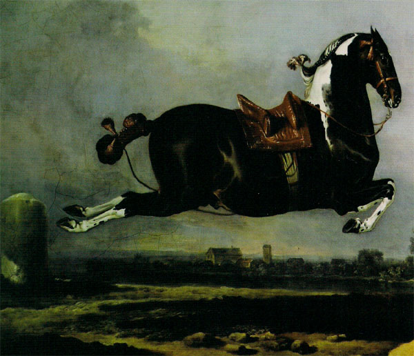 列支敦士登王侯收藏品,由瓦杜茲重返維也納 1700年左右,布面油畫(huà),260.4 cm×211cm 作者:約翰·格奧爾格·馮·漢密爾頓(1672-1737年) 漢密爾頓是18世紀(jì)一位勤奮的編年史作者,他曾記載馬匹接受古典馬術(shù)訓(xùn)練的歷史。 這幅作品充滿了不同尋常的自相矛盾之處,一匹健壯的花斑牡馬,正自覺(jué)地表演馬術(shù)訓(xùn)練中的Levade(馬術(shù)表演中的一種動(dòng)作,馬前肢揚(yáng)起,身體成45度角向前傾斜,然后騰空后蹄),Levade是“馬術(shù)跳躍練習(xí)” (簡(jiǎn)單來(lái)說(shuō)就是一系列控制下的跳躍動(dòng)作)中最初級(jí)的動(dòng)作,是其它復(fù)雜的馬術(shù)訓(xùn)練課程的基礎(chǔ)。也就是說(shuō),畫(huà)家描繪了一匹駿馬,它未受人約束,但卻完成了一個(gè)原本需要指令的古典馬術(shù)動(dòng)作。不管以前還是現(xiàn)在,西班牙駿馬最適合表演對(duì)身體和精神都有著嚴(yán)格要求的傳統(tǒng)馬術(shù)動(dòng)作。雖然現(xiàn)在提起馬術(shù)表演,人們大多會(huì)想起傳統(tǒng)的白色利比扎馬,但在18世紀(jì)非常流行用雜色或身帶花斑的西班牙駿馬進(jìn)行馬術(shù)表演。 |