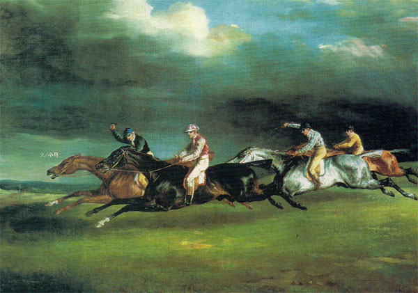 《埃普瑟姆的賽馬》是18世紀(jì)末19世紀(jì)初期,法國浪漫主義天才畫家席里柯后期馬畫中最具魅力的一幅的作品,這一時期他創(chuàng)作了一系列與馬有關(guān)給人心靈安慰、愉快的風(fēng)俗畫。 18世紀(jì)的英國賽馬非常興盛,乃至當(dāng)時的英國王室都樂此不疲。當(dāng)時在英國逗留的席里柯對觀看賽馬也產(chǎn)生濃厚的興趣,并且還親自加入了騎馬俱樂部,賽馬自然也就成為畫家最熱衷的表現(xiàn)題材。 在欣賞這幅作品時,我們首先會被三匹拉長軀體的烈馬所深深吸引,張大的鼻孔,后抿的耳朵,怒吼般的嘴巴,飛般的鐵蹄。與天空翻滾的流云風(fēng)格都相距甚遠,浩瀚的平原,錚錚的鐵蹄,我們似乎可以感受到馬兒呼嘯而過的震撼力,如此以各種姿勢來描繪馬的畫家絕無僅有。畫面的速度感給人一種非常真實的感受,三種顏色的馬正是在1821年舉辦的德比大賽馬時的前三甲。而且分別借用了他們的顏色,菊花青,茶褐色,深茶色。 雖然1872年的愛德華·麥布利吉在攝影實驗中證明馬在飛奔中像席里柯描繪的這種姿勢不會存在,這只是在賽馬版畫中的習(xí)慣。但這不重要,藝術(shù)的表現(xiàn)形式多種多樣,貴在表現(xiàn)的是一種精神,一種永遠向前的生命力。 |