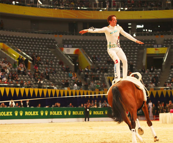 我希望中國的騎手都有美好的未來,真心祝福FEI 世界杯中國聯(lián)賽越辦越好!感謝你們給我此次在中國展示馬背體操這項運動的機會!我期待著日后可以和中國的馬背體操選手同場競技!——帕特里克·盧瑟(Patric Looser) 在2011 年國際馬聯(lián)場地障礙世界杯中國聯(lián)賽第三站的賽場上,到場嘉賓還享受了另外一種人與馬的完美組合——馬背體操。來自德國的世界冠軍帕特里克·盧瑟(Patric Looser)用精彩的演出為我們演繹了一場令人驚嘆的馬背體操。這是盧瑟第一次來到中國,能夠在這里進行表演,他很開心:“中國在體操上很有實力,我相信中國在馬背體操這個項目上也會潛力無限?!?/div> 馬背體操,顧名思義就是在馬背上進行體操動作。實際上馬背體操也曾經是奧運會的正式比賽項目,因為種種原因退出奧運大家庭。但該項目在歐美一些馬術運動開展廣泛的國家和地區(qū)有大量的群眾基礎。事實上,中國和馬背體操也很有淵源。從考古發(fā)現(xiàn)的資料顯示,中國早在漢代的時候就已經有專門的馬上技巧表演,并且在當時成為上層社會的重要觀賞項目,這些都能從漢代出土的文物壁畫中得到佐證。 |