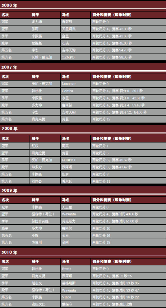 來(lái)自中國(guó)香港的騎手林子心在2011年的比賽中 北京西塢大獎(jiǎng)賽創(chuàng)立于2006年,至今已成功舉辦過(guò)六屆,是目前國(guó)內(nèi)馬術(shù)運(yùn)動(dòng)市場(chǎng)化運(yùn)作最高水平的經(jīng)典品牌賽事,也是全國(guó)性馬術(shù)比賽中最隆重的賽事活動(dòng),近年來(lái)逐漸受到國(guó)內(nèi)外馬術(shù)界的關(guān)注。 賽事項(xiàng)目設(shè)置有場(chǎng)地障礙賽和傳統(tǒng)障礙超高賽(亦叫能力超高賽),其中障礙超高賽紀(jì)錄已被中國(guó)馬術(shù)協(xié)會(huì)確認(rèn),成為中國(guó)紀(jì)錄。 大獎(jiǎng)賽于每年9月的第二個(gè)周末在北京西塢鄉(xiāng)村馬術(shù)俱樂(lè)部舉行,馬術(shù)場(chǎng)地障礙賽的要求是根據(jù)全國(guó)當(dāng)年積分排名進(jìn)行選定的;傳統(tǒng)障礙超高賽是全國(guó)開(kāi)放報(bào)名,報(bào)名者達(dá)到5人及以上才舉行該項(xiàng)比賽。 大獎(jiǎng)賽期間還舉辦與馬術(shù)運(yùn)動(dòng)相關(guān)產(chǎn)品展示、馬術(shù)運(yùn)動(dòng)推廣、與馬相關(guān)的藝術(shù)品展賣(mài)等活動(dòng)。比賽最后一天當(dāng)晚還舉辦慶祝晚宴,社會(huì)名流、商業(yè)精英、演藝明星、媒體人、外國(guó)友人、馬術(shù)愛(ài)好者歡聚一堂,回顧過(guò)去,暢想未來(lái)。 傳統(tǒng)大戲:障礙超高賽 傳統(tǒng)障礙超高賽是在最后進(jìn)行的一場(chǎng)賽事,因?yàn)殡y度大,受到關(guān)注也大。在6年的西塢大獎(jiǎng)賽中只舉辦過(guò)3次,未能按屆舉辦的主要原因是報(bào)名不夠5名或天氣及場(chǎng)地因素不允許。三屆比賽成績(jī)見(jiàn)表1,從表1可以看出,運(yùn)動(dòng)員多力坤無(wú)疑是中國(guó)場(chǎng)地超高賽跳得最高的選手,人們說(shuō):“多力坤的坐騎白青毛馬‘魯阿努’仿佛就是為‘能力超高賽’所生的?!?/div> 壓軸大戲:場(chǎng)地障礙賽 場(chǎng)地障礙賽是西塢大獎(jiǎng)賽的“壓軸”大戲,參賽運(yùn)動(dòng)員都是此項(xiàng)領(lǐng)域的高手,技術(shù)精湛,比賽精彩。六屆比賽的成績(jī)見(jiàn)表2,從表2中可以看出,在六屆比賽中,每屆的冠軍皆不同。 特殊戲份:西塢大獎(jiǎng)賽的其他亮點(diǎn) 除了場(chǎng)地障礙賽和能力超高賽之外,還有其他精彩之處值得一提。 (1)獎(jiǎng)金高:西塢大獎(jiǎng)賽在國(guó)內(nèi)馬術(shù)比賽中是最高的,自2006年開(kāi)始的總獎(jiǎng)金10萬(wàn)元,到2011年增長(zhǎng)到39.9萬(wàn)元,單場(chǎng)場(chǎng)地障礙賽2006年的獎(jiǎng)金是3萬(wàn)元,2008年為5萬(wàn)元,2011年為10萬(wàn)元。能力超高賽的獎(jiǎng)金最高時(shí)達(dá)2萬(wàn)元。 (2)設(shè)置冠軍馬飼養(yǎng)員獎(jiǎng):這個(gè)獎(jiǎng)項(xiàng)意在鼓勵(lì)飼養(yǎng)員把馬養(yǎng)好,是一個(gè)有意義的獎(jiǎng)項(xiàng)。在2010年這項(xiàng)獎(jiǎng)金為:場(chǎng)地障礙賽和能力超高賽冠軍馬的飼養(yǎng)員各2000元。獎(jiǎng)金不高,但意義深遠(yuǎn)。 (3)為冠軍贈(zèng)馬鞍:艾奇達(dá)馬具公司熱心支持馬術(shù)事業(yè),為每屆場(chǎng)地障礙賽冠軍贈(zèng)送馬鞍一盤(pán)。 (4)觀(guān)眾人數(shù)多:每次比賽都有大約2000名觀(guān)眾來(lái)現(xiàn)場(chǎng)觀(guān)看,創(chuàng)造除廣州亞運(yùn)會(huì)、濟(jì)南全運(yùn)會(huì)馬術(shù)比賽之外的人數(shù)最多紀(jì)錄。 (5)西塢晚宴:亦號(hào)稱(chēng)“西塢千人晚宴”,宴會(huì)廳由馬術(shù)室內(nèi)大廳臨時(shí)改成,該晚宴具有獨(dú)特的特色,名人薈萃,集文藝活動(dòng)、公益拍賣(mài)成一體,成為西塢大獎(jiǎng)賽不可或缺的一個(gè)組成部分。 (6)運(yùn)動(dòng)馬獸醫(yī)基金:2011年共通過(guò)拍賣(mài)籌得運(yùn)動(dòng)馬獸醫(yī)基金71萬(wàn)元,用于為獸醫(yī)事業(yè)(包括教育培訓(xùn)、儀器設(shè)備改善等)提供公益資助。 (7)奧運(yùn)選手和國(guó)際選手參賽:西塢大獎(jiǎng)賽2011年的特色是有7名奧運(yùn)選手(其中4名中國(guó)奧運(yùn)選手)參賽,同時(shí)有來(lái)自國(guó)外(意大利、丹麥、德國(guó)等)及中國(guó)香港的運(yùn)動(dòng)員參賽。 (8)接力賽、馬主賽是西塢大獎(jiǎng)賽的特色項(xiàng)目。其中,馬主賽的目的是讓馬主有參賽的機(jī)會(huì),刺激和鼓勵(lì)馬主更加熱愛(ài)這項(xiàng)運(yùn)動(dòng)。 (9)名人解說(shuō):中央電視臺(tái)著名主持人蔡猛先生和著名音樂(lè)制作人巒樹(shù)先生的解說(shuō)是西塢大獎(jiǎng)賽的另一亮點(diǎn)。 名人談西塢大獎(jiǎng)賽 作為民間發(fā)起的、由企業(yè)的贊助馬術(shù)比賽項(xiàng)目,馬界名人的觀(guān)點(diǎn)值得我們思考。 馬界著名馬人、北京稻香湖馬術(shù)俱樂(lè)部總經(jīng)理王冀豫說(shuō):“西塢大獎(jiǎng)賽無(wú)疑是自下而上,群眾性體育運(yùn)動(dòng)落實(shí)在馬術(shù)運(yùn)動(dòng)上的結(jié)晶,表現(xiàn)了國(guó)際馬術(shù)運(yùn)動(dòng)的共性,如騎手、馬主、贊助商的鐵三角關(guān)系及俱樂(lè)部聯(lián)盟的形式.....。賽事促成中國(guó)馬術(shù)協(xié)會(huì)走出體制,恢復(fù)以服務(wù)于推動(dòng)馬術(shù)運(yùn)動(dòng)健康發(fā)展為使命的應(yīng)有作用。簡(jiǎn)言之:本賽事集約和調(diào)動(dòng)了馬術(shù)界的積極因素,開(kāi)始啟動(dòng)原動(dòng)力,并盡可能的將消極因素轉(zhuǎn)變?yōu)榉e極因素,有化腐