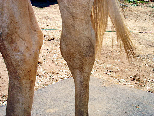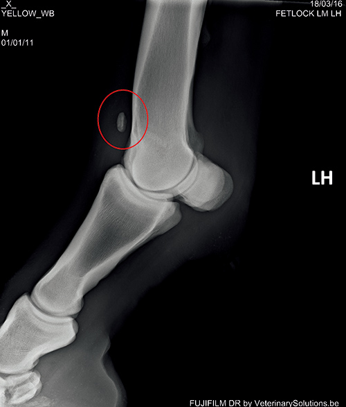 馬剝脫性骨軟骨炎 (OCD) 很多馬場主、馬主曾遇到過這種情況:自己的馬匹出現(xiàn)關節(jié)腫脹、跛行的癥狀。獸醫(yī)檢查后確診是關節(jié)炎,關節(jié)里有軟骨碎片。他們覺得很奇怪,明明運動沒有過量、也沒磕到碰到,怎么就得關節(jié)炎了呢?還治不好(目前在國內(nèi))。這個無妄之災是馬兒在娘胎里就帶來的疾病——剝脫性骨軟骨炎,英文簡稱為 OCD。 正常情況下,在馬駒1歲左右時隨著骨骼的發(fā)育,部分軟骨通過軟骨骨化轉為骨密質。但患剝脫性骨軟骨炎的馬匹的軟骨骨化不完全。發(fā)育異常的軟骨會存在于關節(jié)中,成為骨關節(jié)疾病的潛在病因。這種缺陷會導致病變軟骨無法貼合骨密質,甚至有軟骨碎片掉落殘留在關節(jié)囊內(nèi),不斷刺激關節(jié),引起炎癥和關節(jié)腫脹。 OCD的癥狀 關節(jié)腫脹是剝脫性關節(jié)病的典型癥狀。如上圖,馬匹左后肢關節(jié)囊內(nèi)嚴重的炎癥反應造成大量關節(jié)液積聚于關節(jié)腔內(nèi)。 跗關節(jié)部腱鞘炎是最常見的,患病部位會嚴重腫脹。但事實上其并沒有看起來的那么嚴重。其他患病部位如飛節(jié)、后膝關節(jié)等盡管癥狀相對沒那么明顯,對馬匹的影響卻更嚴重。需及時請獸醫(yī)做進一步的檢查和治療?;疾●R匹可能出現(xiàn)跛行,但跛行程度常發(fā)生變化。馬匹臥地休息后不愿意起來或站立困難等。此外還可能出現(xiàn)異常站姿、活動量減少、動作不自然等癥狀。 診斷和治療臨床獸醫(yī)可以通過臨床癥狀作出初步診斷。確診需要做 X 線片檢查。 例如上圖中紅圈內(nèi)是一塊很明顯的游離于球節(jié)的骨軟骨碎片??梢圆捎藐P節(jié)鏡做進一步檢查,以確定關節(jié)的損傷程度,并通過微創(chuàng)手術去除軟骨碎片,如上圖。在國外,馬主通常會在馬匹三、四歲的時候請獸醫(yī)做一次全面的 X 線片檢查來評估它們的關節(jié),一旦發(fā)現(xiàn) OCD,及早進行手術能最大程度減少其對關節(jié)的損傷,保住馬兒未來的運動生命。 并非所有OCD患病馬匹都會表現(xiàn)出臨床癥狀。許多馬匹到達成年以后,在接受體檢時通過 X 線片檢查才被發(fā)現(xiàn) OCD,但這個時候關節(jié)鏡手術治療的意義已經(jīng)不大,因為關節(jié)已經(jīng)受到損傷,而且這種損傷是不可逆的。 當馬匹在交易前體檢發(fā)現(xiàn)存在OCD,情況則會變得很復雜。作為獸醫(yī),很難去作出一個讓交易雙方都滿意的治療建議以及預后判斷。他需要考慮很多方面的因素,如馬匹的病歷記錄、運動表現(xiàn)、病變部位等。此外,慢性 OCD 還是造成老齡馬匹跛行的重要病因。這是因為長期的關節(jié)炎癥最后很有可能發(fā)展為關節(jié)炎。 獸醫(yī)會根據(jù)馬匹自身情況、臨床癥狀不同以及病情輕重制定治療方案。此外,還需考慮馬匹年齡和它之后的發(fā)展計劃。因此,最好能咨詢獸醫(yī)骨科專家,他會告訴你不同治療方案的利與弊。 文、圖/彭煜師 |