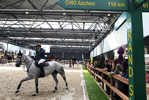 大師賽并不把觀眾與參賽者的活動(dòng)空間分割得很清晰,而是從設(shè)計(jì)上就試圖實(shí)現(xiàn)雙方的“零距離”接觸,比如讓展商包圍著熱身場(chǎng),餐飲區(qū)旁邊就是馬匹通道。五個(gè)允許觀眾進(jìn)入的展館內(nèi),可以說只要你想,就能在幾乎任何地方見到你欣賞的人馬組合。在重視速度與耐力的 Indoor Derby(室內(nèi)德比)障礙賽中,離賽場(chǎng)最近的一個(gè)熱身場(chǎng)就變?yōu)橹髻悎?chǎng)的附加場(chǎng)地,兩個(gè)場(chǎng)地中間的狹窄通道旁邊站滿了觀眾,像越野賽一樣憑欄等待著騎手從距離最近的地方經(jīng)過。