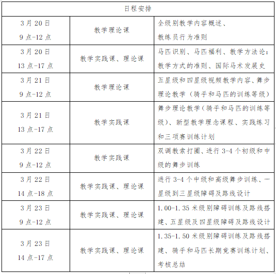 中國馬術(shù)協(xié)會關(guān)于舉辦四星和五星級(高級教練員)培訓(xùn)班的通知 各相關(guān)單位、會員、馬術(shù)愛好者: 馬術(shù)運動的發(fā)展離不開優(yōu)秀的教練員、運動員做出的貢獻和投入。為了鼓勵馬術(shù)運動的傳承,中國馬術(shù)協(xié)會將針對優(yōu)秀的教練員、運動員申請教練員技術(shù)等級開辟特殊政策通道,對有對應(yīng)歷史比賽成績和教學(xué)經(jīng)驗的教練員、運動員進行定向培訓(xùn)定星。 為了提升馬術(shù)運動教學(xué)和訓(xùn)練水平,根據(jù)中國馬術(shù)協(xié)會教練員培訓(xùn)計劃,馬術(shù)高級教練培訓(xùn)將于2023年3月20日-23日在線下舉辦。本次培訓(xùn)將由經(jīng)驗豐富的外教來華授課,進一步提升執(zhí)教理論及實踐水平。培訓(xùn)合格者將對應(yīng)報名條件被授予中國馬術(shù)協(xié)會星級教練員能力水平證書。 現(xiàn)就本次培訓(xùn)相關(guān)事宜通知如下: 一、培訓(xùn)時間、地點 (一)時間:2023年3月20日(周一)-23日(周四) (二)地點:待定 二、培訓(xùn)內(nèi)容 ※具體日程安排詳見后續(xù)日程安排表,根據(jù)報名人數(shù)可能會有調(diào)整。 三、報名資格要求 (一)5星級: 1.年滿35周歲,身體健康; 2.代表國家隊參加過奧運或亞運會的運動員,或在國家馬術(shù)隊任教1屆奧運或亞運及以上的教練員; 3.執(zhí)教年限在10年以上;帶訓(xùn)學(xué)員中至少有2名獲得國二級騎手等級或1名學(xué)員獲得國一級騎手等級,學(xué)員需要在該名教練帶訓(xùn)期間,獲得相應(yīng)騎手等級。 (二)4星級: 1.年滿30周歲,身體健康; 2.至少獲得過一屆全運會馬術(shù)項目決賽前八名成績;或獲得過兩屆及以上全運會馬術(shù)項目決賽個人有效成績的運動員;或獲得過三屆及以上全國錦標(biāo)賽決賽個人有效成績的運動員。 3.執(zhí)教年限在10年以上;帶訓(xùn)學(xué)員中至少有2名學(xué)員獲得中一級騎手等級或1名學(xué)員獲得國三級騎手等級。 四、報名事項 (一)報名時間:自即日起至2023年2月20日12:00前報名并提交審核材料于報名專用郵箱,逾期報名無效。 (二)報名資料:報名表電子版,一寸白底照片2張及電子版,身份證復(fù)印件,有效成績或身份證明復(fù)印件。 (三)報名方式:將報名表、一寸白底照片電子版等文件打包發(fā)送至報名郵箱。現(xiàn)場報道時需提供2張一寸白底照片(背面寫姓名)、身份證復(fù)印件、有效成績或身份證明復(fù)印件。 報名郵箱:liu.ying@ceatpo.com (四)報名確認:學(xué)員報名即需提交審核材料,確認后請于截止日期前繳納報名費,最終以報名確認信息或報名確認郵件為準(zhǔn)。 (五)退課:課程準(zhǔn)備工作按報名人數(shù)進行,因此報名一旦確認即產(chǎn)生費用。開課前15天及以上,可退款50%;開課前7天以上,不足15天,可退款25%;開課前7天內(nèi)(包含7天),不予退款。 (六)報名、咨詢聯(lián)系人:劉穎 聯(lián)系電話:18612650507 微信號:liu18612650507 郵箱:liu.ying@ceatpo.com (七)收費標(biāo)準(zhǔn):鼓勵為馬術(shù)運動競技水平提高做過貢獻的教練員,僅本次報名費用優(yōu)惠20%。 4星級:原價12000元/人,優(yōu)惠后為9600元/人 5星級:原價13500元/人,優(yōu)惠后為10800元/人 (八)付款方式:銀行轉(zhuǎn)賬 匯款銀行:北京銀行天壇支行 匯款賬戶名:北京中聯(lián)金馬體育發(fā)展有限公司 賬號:20000045341600037064420 ※備注:1.【4或5星級教練員- 姓名 - 所繳費用】 2.匯款截圖或退款通知單請拍照截圖發(fā)送至報名郵箱:liu.ying@ceatpo.com 3.交通食宿費用自理 (九)如遇不可抗力因素(政府行為、戰(zhàn)爭、自然災(zāi)害、疫情問題等)造成學(xué)員的損失,中國馬術(shù)協(xié)會根據(jù)不同情況酌情處理。 附件: 培訓(xùn)報名表(四星) 培訓(xùn)報名表(五星) 中國馬術(shù)協(xié)會 2023年2月3日 掃碼可獲取附件 |