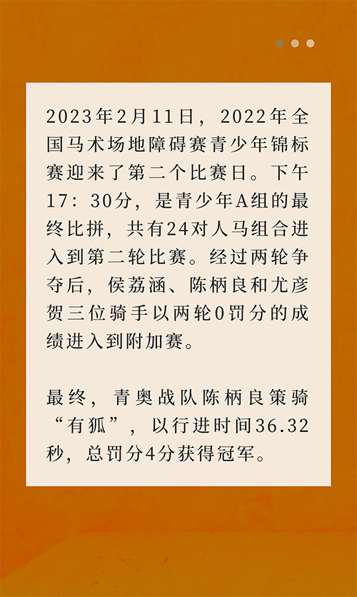 侯荔涵策騎馬匹“Lucky青”,以附加賽4罰分,行進(jìn)時間40.03秒的成績獲得亞軍,尤彥賀策騎馬匹“紀(jì)梵希”,以附加賽8罰分,行進(jìn)時間42.08秒的成績獲得季軍。 賽后,青奧戰(zhàn)隊陳柄良接受了《馬術(shù)》雜志的采訪。此次他一共帶了兩匹馬前來比賽,其中,合作一年半的馬匹“有狐”在此次比賽中與他配合突出,并最終取得了好成績。陳柄良在跟另一匹馬“大明大放”的配合過程中出了些失誤,但是他很快振作精神,再次與“有狐”搭檔登上了賽場,在與“有狐”的配合過程中,他全程的表現(xiàn)很鎮(zhèn)定,在“有狐”的幫助下拿到了此次比賽的冠軍。 “‘有狐’是一匹很聰明的馬,他會思考他的騎手每個動作的含義,努力去配合騎手的動作習(xí)慣,可以說他是我的半個老師。我之前看過很多大騎手的采訪,他們一生中都會有幾匹讓他們受益匪淺的馬,對我來說,在這個階段,‘有狐’就是那匹馬?!?/div> 陳柄良今年21歲,在參加青少年錦標(biāo)賽的騎手中年齡較大,這也意味著,對他來講,能參加全國青少年錦標(biāo)賽的機(jī)會也越來越少了?!拔耶?dāng)時在想,這可能是我能參加的最后一場青少年錦標(biāo)賽了,我一定要全力以赴不留遺憾?!彪m然競爭對手也都實力強(qiáng)勁,但陳柄良依舊頂住了壓力?!皦毫Υ蟠_實會緊張,會發(fā)揮失常。但當(dāng)壓力大到一個頂點之后,就無所謂了。而且我之前參加過幾屆青少年錦標(biāo)賽,都多多少少留有遺憾,這一次,我的最終目標(biāo)就是不留遺憾地完成整個比賽?!?/div> 目前,正在北京讀大學(xué)的陳柄良,把未來的側(cè)重點放在了馬術(shù)上。“我的短期目標(biāo)是希望自己在學(xué)業(yè)完成之前,成為一名能獨當(dāng)一面的馬術(shù)騎手,能不依賴教練和父母,而獨立訓(xùn)練、參賽。長期目標(biāo)是將來從事馬術(shù)行業(yè),能夠活躍在賽場上,并且成為一名優(yōu)秀的馬術(shù)教練?!?/div> 陳柄良的教練王鵬皓分享了青奧戰(zhàn)隊的訓(xùn)練經(jīng)驗。他表示:“我們的團(tuán)隊在去年12月就做了今年2月的比賽規(guī)劃,以賽代練讓騎手們早早地進(jìn)入比賽的狀態(tài)。在1月份我們打了2022超級馬術(shù)俱樂部聯(lián)賽總決賽 & 2023天星調(diào)良馬術(shù)賀歲杯,過年的時間讓馬休息后,轉(zhuǎn)過年,青奧戰(zhàn)隊就來到了長三角全明星鳥巢之路南北爭霸賽的賽場,經(jīng)過一系列爭奪,我們獲得了全明星鳥巢之路南北爭霸賽的冠軍。就這樣,帶著一個良好的競技狀態(tài),我們的團(tuán)隊來參加了全國場地障礙賽青少年錦標(biāo)賽?!?/div> “在6年前,青奧戰(zhàn)隊組建的時候,那時候我們整個團(tuán)隊就僅有我和Vajk教練兩人。但那時,我們的信念很堅定。我們可以輸,但絕不會放棄。就這樣6年走了過來,我們的團(tuán)隊漸漸壯大,有了很多年輕的血液,雖然我們的團(tuán)隊還有很大的提升空間,但這幾年來,我們已經(jīng)從一個默默無聞的團(tuán)隊,逐漸被人們看見,被人們提及。” 圖/依米大麥 文/門景鈺 |