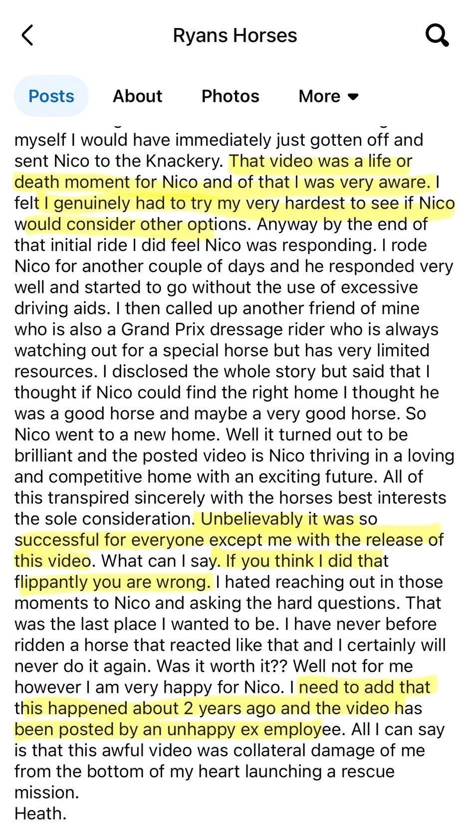 66歲的澳大利亞奧運會騎手希思·瑞安(Heath Ryan),近日因為一段顯示其鞭打馬匹42次的視頻在網(wǎng)絡(luò)廣泛傳播。希思·瑞安曾代表澳大利亞參加2008年北京奧運會盛裝舞步項目,2024年仍在四星級三項賽中出賽。 目前澳大利亞馬術(shù)協(xié)會于6月12日對其做出臨時停賽決定。并對視頻內(nèi)容表示“極度震驚與擔(dān)憂”。面對這一結(jié)果,希思·瑞安在社交媒體上發(fā)表長文進行辯解,并稱該視頻中的行為是在執(zhí)行一項“營救任務(wù)”。 ———————————————————— 希思·瑞安在聲明中稱,這段視頻拍攝于兩年前,馬名為“Nico”,是一匹六歲的年輕馬,被送往他家前原本打算送到屠宰場。 希思·瑞安說:“‘Nico’是由旗下的優(yōu)秀種馬繁育而成的,但其前主人卻因‘Nico’的不當(dāng)行為曾被送進重癥監(jiān)護室。”他認為這匹馬一直是個“問題兒童”,會突然停下不動,情況越來越嚴重,直到發(fā)生了那場事故。他強調(diào),這位前主人是一位體型嬌小的女士,“絕不可能對馬使用暴力”,意在說明“Nico”的問題并非源于人為傷害。 根據(jù)希思·瑞安的描述,“Nico”的“問題”是拒絕前行。然而,從馬匹行為學(xué)的角度看,這很可能是壓力、恐懼或訓(xùn)練方式不當(dāng)?shù)慕Y(jié)果。現(xiàn)代馬術(shù)早已發(fā)展出諸多非暴力、科學(xué)的訓(xùn)練手段,這類“用鞭打解決問題”的做法,既不必要,也不專業(yè)。救馬不該成為打馬的借口。 面對視頻中反復(fù)抽打“Nico”的行為,希思·瑞安解釋道:“我從未騎過這樣的馬,我很遺憾這被拍了下來。但如果我當(dāng)時只考慮自己,我會立刻下馬,把它送走。但那一刻對‘Nico’來說是生死關(guān)頭,我必須盡全力去嘗試。” 問題是,面對一匹血統(tǒng)優(yōu)良的年輕馬,真的沒有更溫和、科學(xué)的方法了嗎?沒有行為專家、專業(yè)調(diào)訓(xùn)師的幫助可尋嗎?相信絕對不是這樣。一位奧運級別的騎手如果面對問題馬的唯一手段是反復(fù)抽打,恐怕真正“出問題”的不是馬,而是他的訓(xùn)練理念與專業(yè)素養(yǎng)。他所謂的“盡最大努力”,是對馬術(shù)訓(xùn)練精髓的徹底背離。 瑞安在聲明的結(jié)尾表示:“這一切都是出于馬匹的最佳利益,結(jié)果對每個人都很成功——除了我,因為視頻被發(fā)布了?!?/span> 希思·瑞安在社交媒體上發(fā)布長篇聲明 他試圖將問題焦點轉(zhuǎn)向“視頻被泄露”,仿佛風(fēng)波的源頭不是行為本身,而是視頻的公開。這種表態(tài),回避了關(guān)鍵問題:如果沒有這段視頻,公眾永遠不會知道這42次鞭打曾經(jīng)發(fā)生。而當(dāng)事件曝光后,他的第一反應(yīng)不是反思和道歉,而是表達自己“被背叛”的憤怒,而這絕對不是承擔(dān)責(zé)任的姿態(tài)。 希思·瑞安稱Nico(圖中馬匹)目前生活得很好 希思·瑞安是奧運騎手,是公眾人物。他的言行不只是個人行為,更傳遞著對待動物、對待錯誤、對待權(quán)力的立場。令人遺憾的是,在這篇長文中,我們看不到一句真誠的道歉,沒有一句對馬匹真正的尊重,而是充斥著“我沒有錯,只是被誤會”的自我辯護。 但不論如何:42次鞭打,不論出于什么理由,都是不可接受的暴力行為。目前,希思·瑞安已被澳大利亞馬協(xié)停賽,國際馬聯(lián)(FEI)也同步執(zhí)行停賽并啟動調(diào)查程序。 “救了馬”不意味著可以施暴,“結(jié)果變好”也不等于過程無錯。真正的好騎手,不是制服最“難搞”的馬,而是能聽懂脆弱的馬在說什么。 你怎么看待這42鞭?馬術(shù)的底線應(yīng)該在哪里?歡迎留言,說出你的觀點。 |