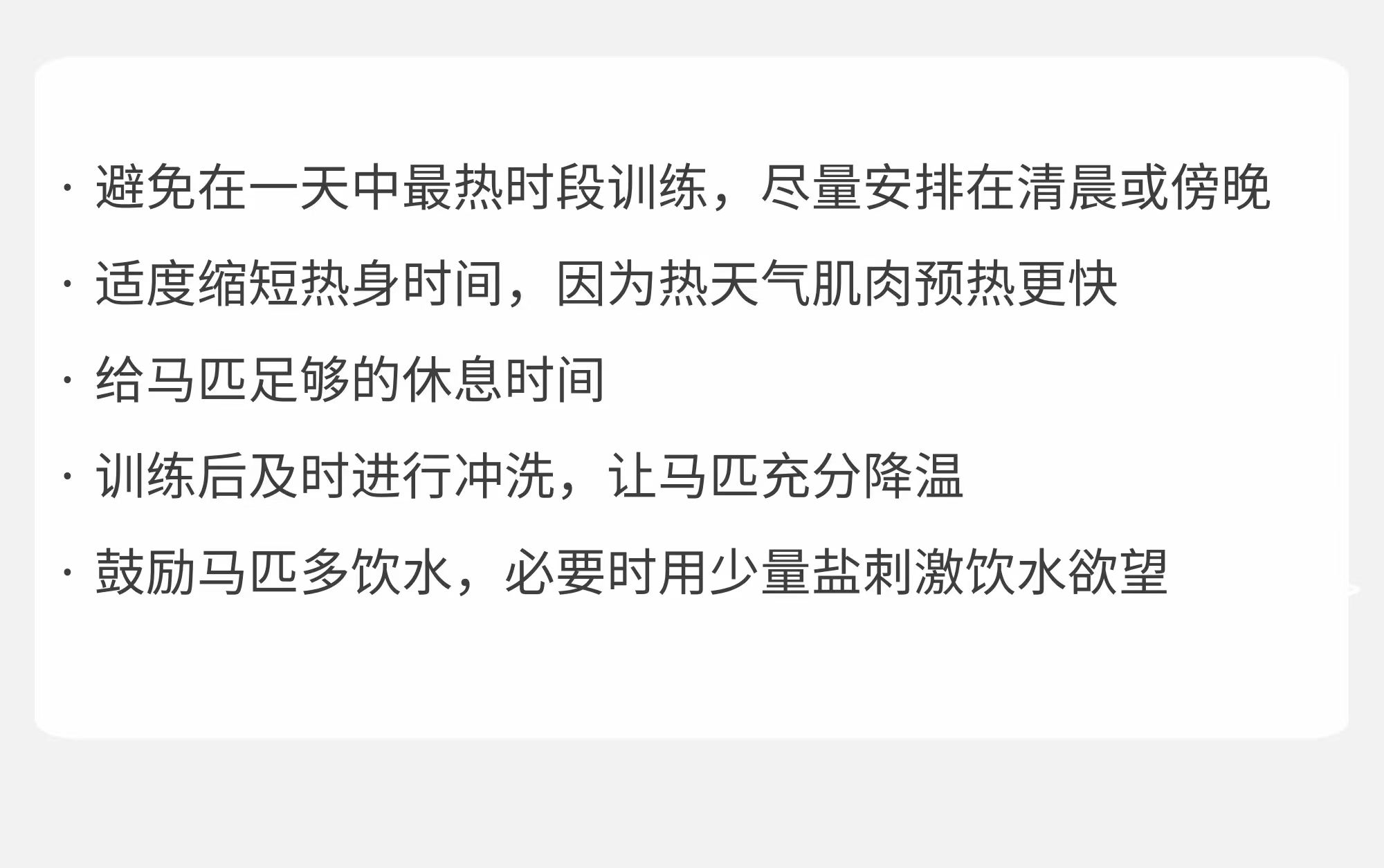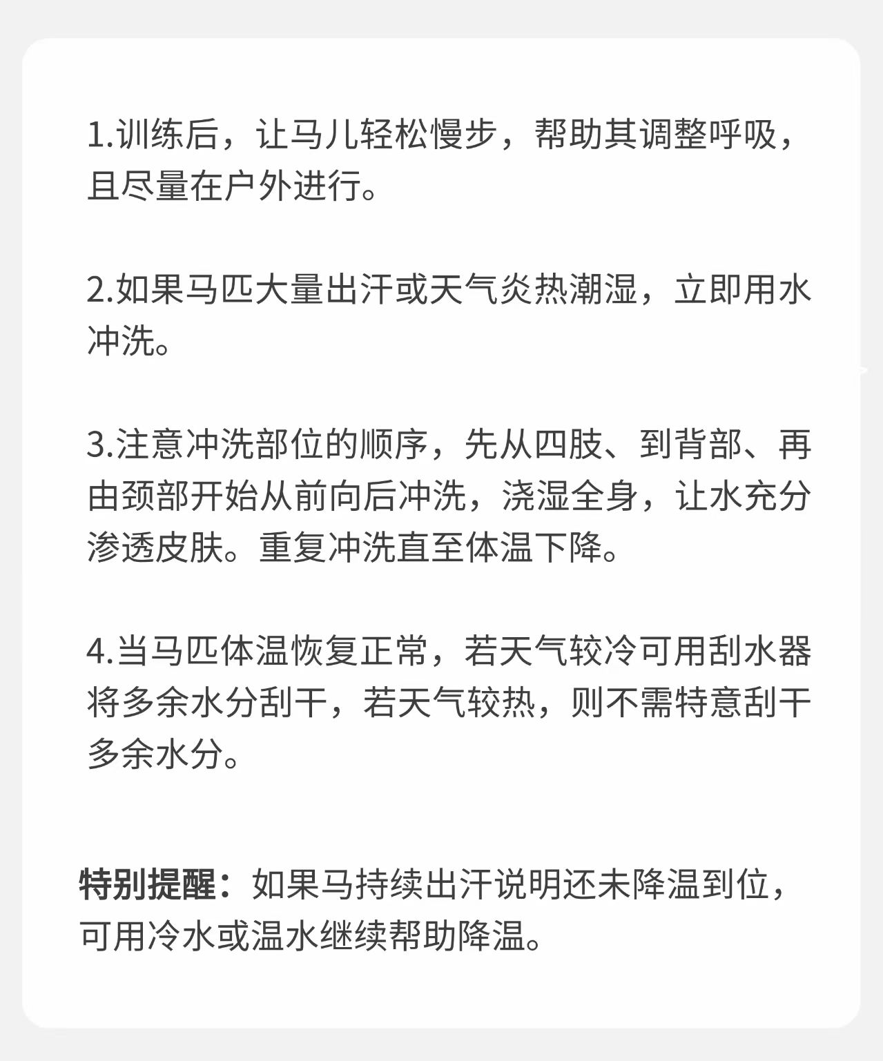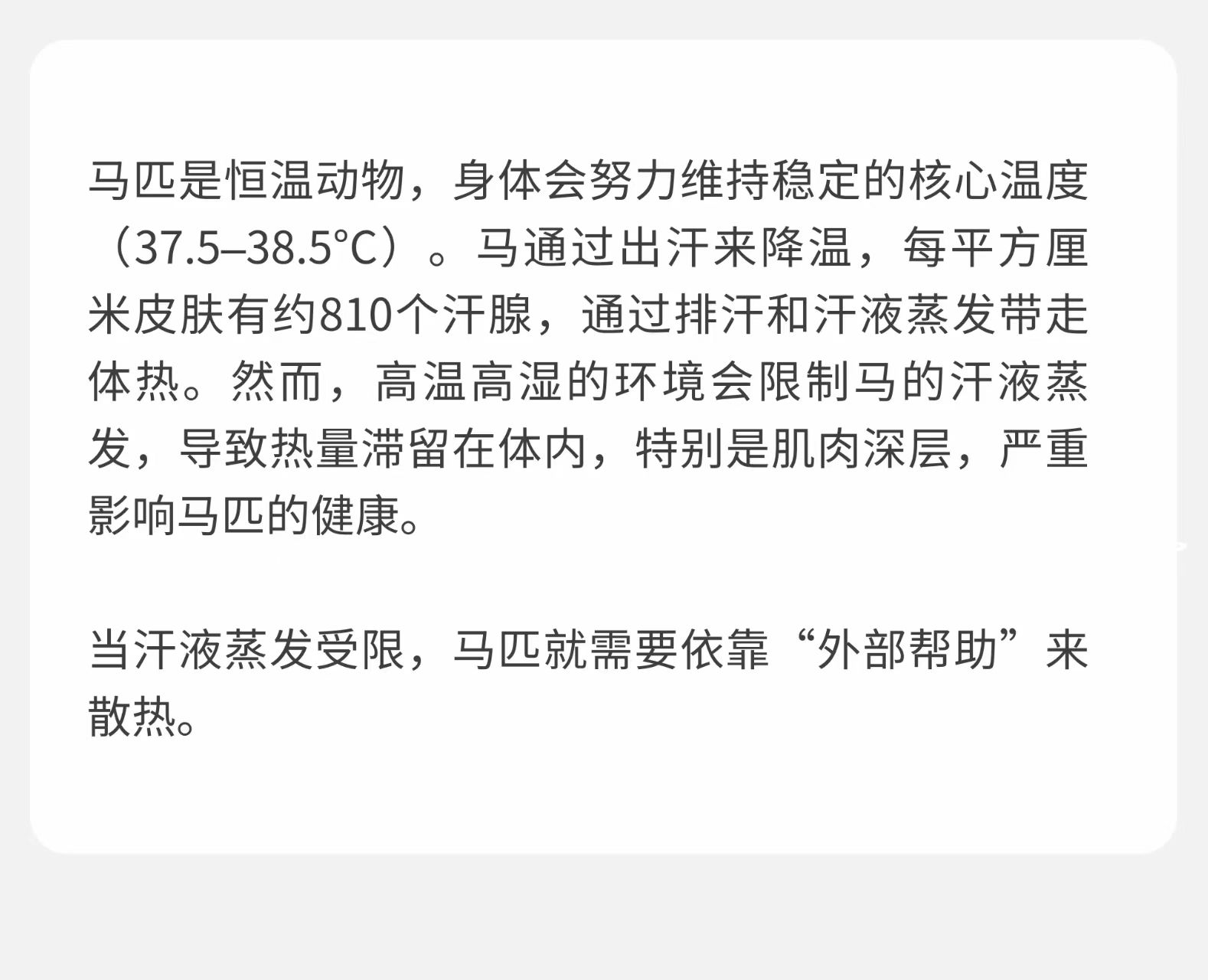 隨著夏季氣溫節(jié)節(jié)攀升,馬匹的健康管理顯得尤為重要。你是否也曾在烈日下為馬兒是否太熱、猶豫該不該沖水和刮水?哪種降溫方式更高效? 別擔(dān)心!本文將從生理機(jī)制、實(shí)用技巧和科研分析各個(gè)方面,全面梳理馬在高溫下的降溫方法與誤區(qū)。 無論你是馬主、教練還是騎手,這都是一份不容錯(cuò)過的夏日守護(hù)指南。 高溫環(huán)境下,科學(xué)、及時(shí)降溫能極大減少馬匹因熱應(yīng)激造成的傷害。合理利用冷水持續(xù)沖洗、適當(dāng)運(yùn)動(dòng)調(diào)節(jié)呼吸、及時(shí)觀察體溫和行為變化,是每個(gè)馬主必備的技能。給馬降溫不是麻煩事,這個(gè)夏天,讓我們一起守護(hù)馬的舒適與安全! |