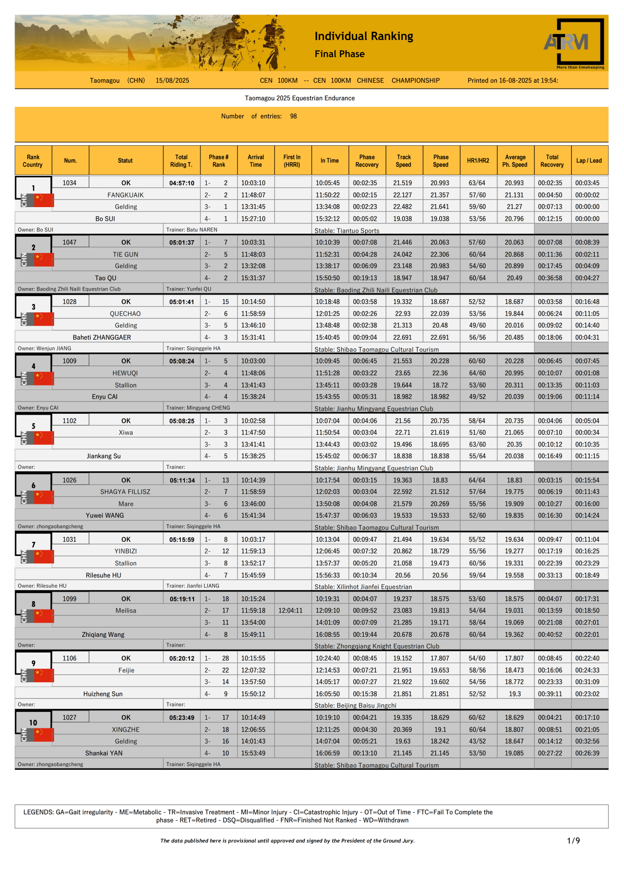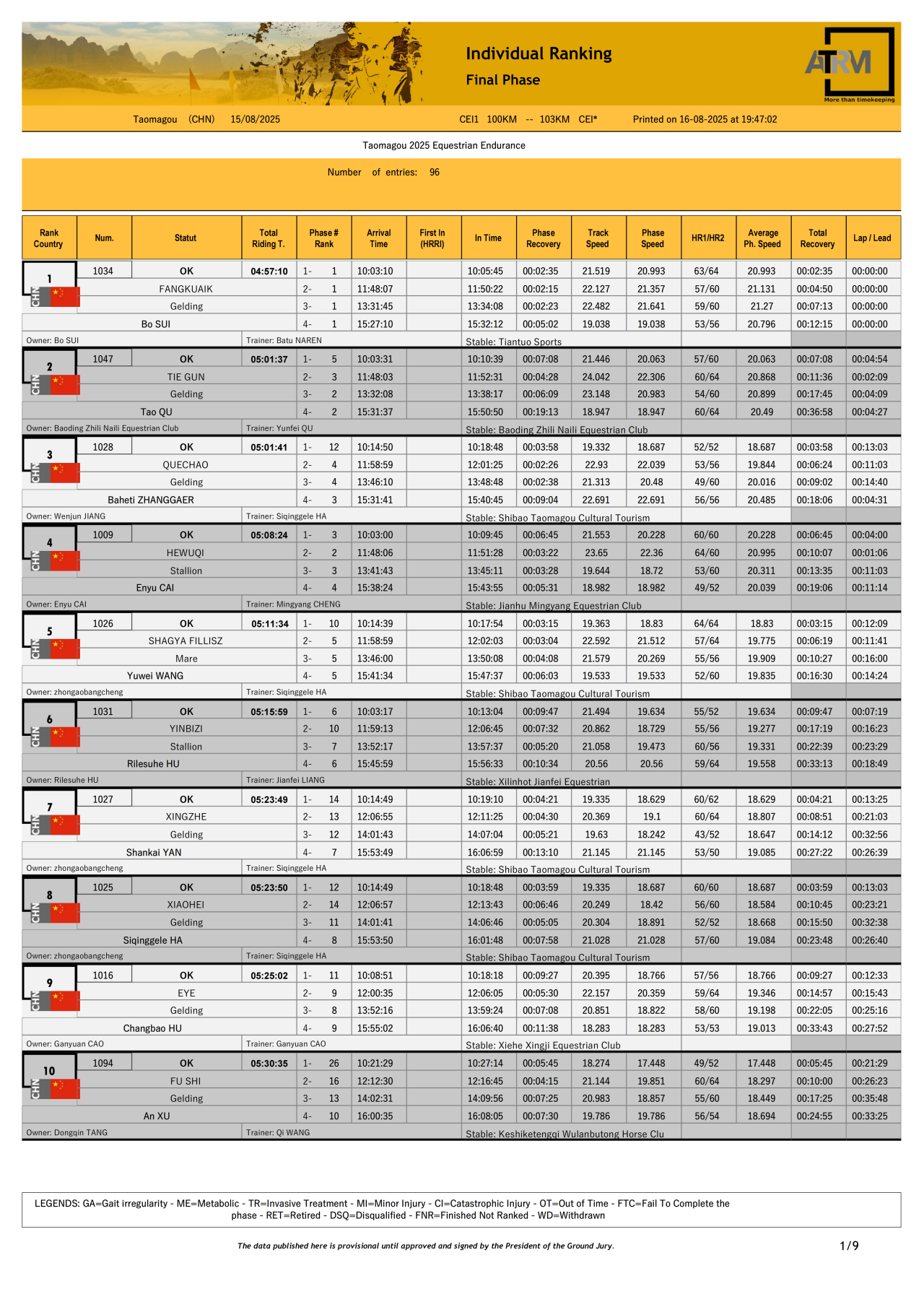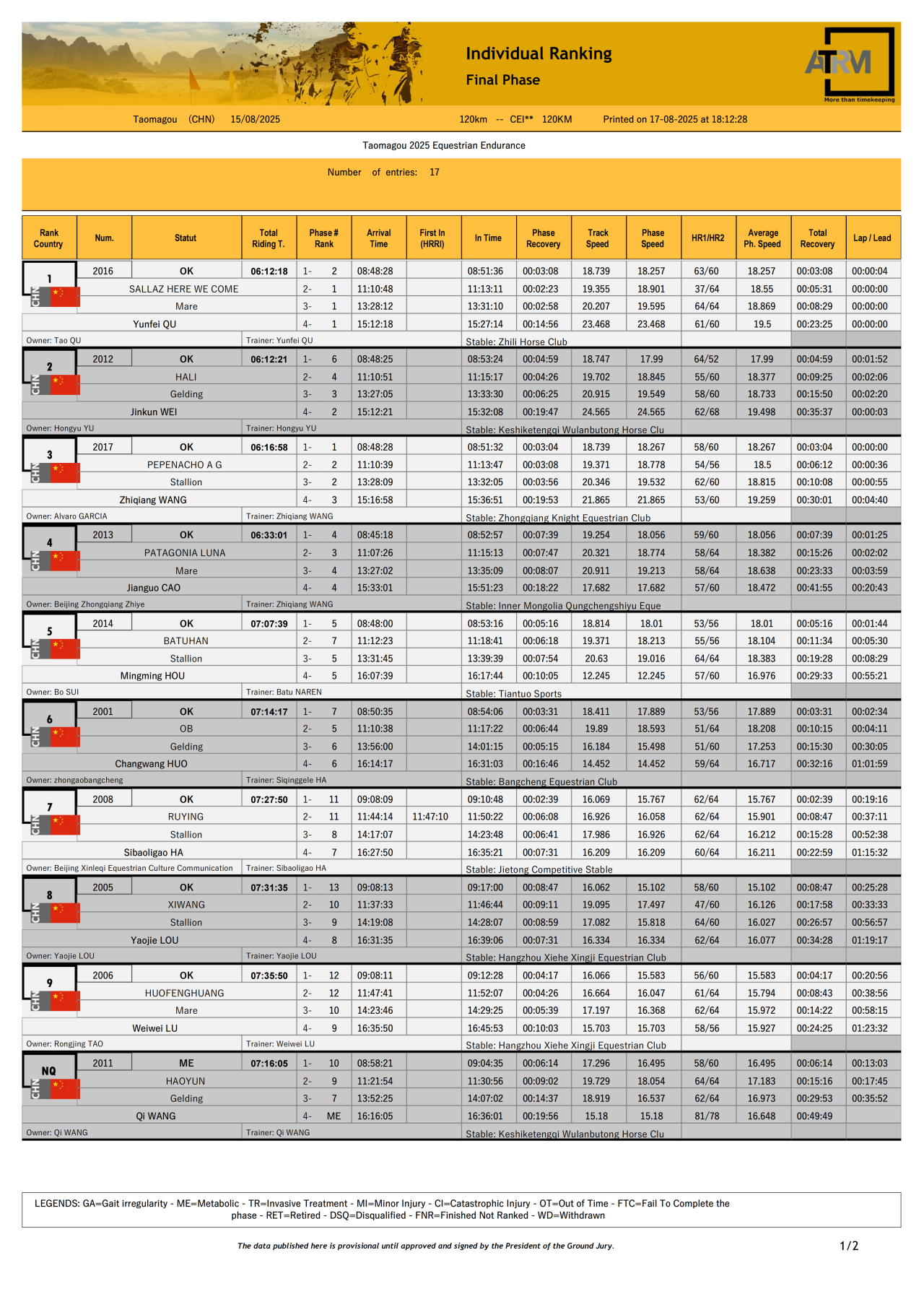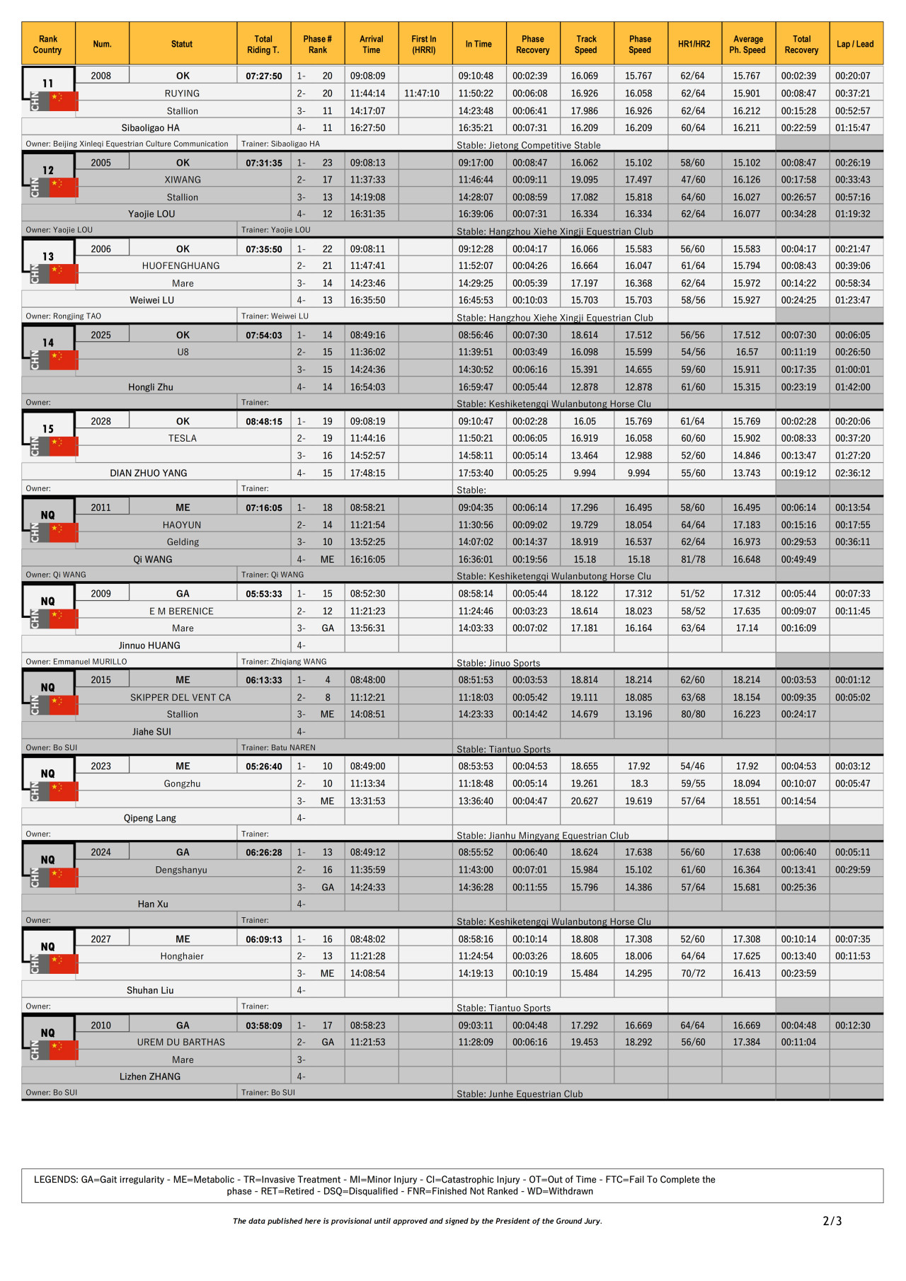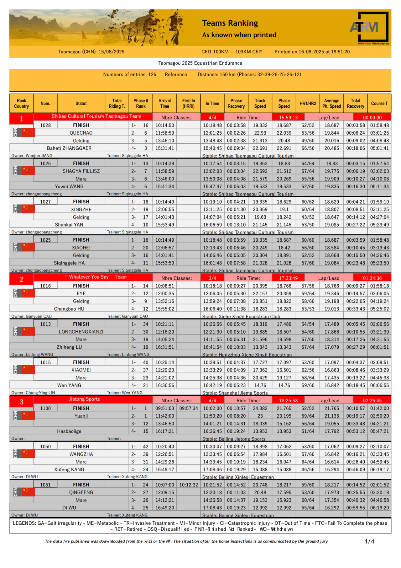 8月17日,隨著最后一組騎手沖過終點線,2025年全國馬術耐力錦標賽暨國際馬術耐力賽在內(nèi)蒙古自治區(qū)包頭市達茂聯(lián)合旗套馬溝田園綜合體圓滿落幕。 這場為期兩天的賽事不僅是中國馬術耐力賽的年度巔峰對決,更是首次實現(xiàn)國內(nèi)錦標賽與國際馬聯(lián)一星級、二星級賽事同場融合辦賽,吸引了全國280余對人馬組合參賽。16日的全國馬術錦標賽與國際馬聯(lián)一星級項目為一賽三制,即同時決出100公里錦標賽個人、團體與國際馬聯(lián)一星賽事的名次。該項目有106對人馬同時出發(fā),創(chuàng)歷史新高。 本次賽事由中國馬術協(xié)會主辦,達爾罕茂明安聯(lián)合旗文體旅游廣電局、套馬溝景區(qū)協(xié)辦。 賽道依托草原地貌與天然河道,地勢開闊、起伏有致,沙土軟硬適中,為騎手和馬匹提供了絕佳的比賽環(huán)境。賽事期間,主辦方還特邀法國專業(yè)計時團隊與11名外籍裁判組成國際技術保障團隊,確保賽事與國際標準接軌。 120KM耐力錦標賽&國際馬聯(lián)CEI2* 17日的比賽于早上6:50正式開始。來自北京京馳馬會的騎手石夢慈(騎手號:2026)搭檔“煥影”一路領先,在賽段3時排名短暫落后到第二,隨后在賽段4重新回到第一,以19.5km/h的平均時速完賽,拿下了120KM耐力錦標賽的冠軍。 120KM耐力錦標賽頒獎儀式 頒獎嘉賓:中國馬術協(xié)會副秘書長、 競賽部部長孫立生先生(右二) 今年16歲的石夢慈接觸耐力賽一年,與“煥影”共同訓練了1個月,她表示,這次的賽道較難,對自己和馬來說都有一定挑戰(zhàn)性。此次奪冠,她非常感謝“煥影”、北京京馳馬會強大的后援團,也特別感謝父母的支持與陪伴。 石夢慈接受采訪 來自直隸馬會的騎手瞿云飛(騎手號:2016)搭檔“我來了”獲得120KM耐力錦標賽亞軍和國際馬聯(lián)CEI2* CIM冠軍。來自克什克騰旗烏蘭布統(tǒng)馬會的騎手魏金昆(騎手號:2012)搭檔“哈里”獲得120KM耐力錦標賽季軍和國際馬聯(lián)CEI2* CIM亞軍。來自中強騎士馬術俱樂部的騎手王志強(騎手號:2017)獲得國際馬聯(lián)CEI2* CIM季軍。 國際馬聯(lián)CEI2* CIM頒獎儀式 頒獎嘉賓:亞洲馬聯(lián)高級官員、 國際四星級裁判葉茂順(右二) 騎手王志強表示,耐力賽對人馬都是極大考驗,“新手騎40公里、80公里已很難,職業(yè)騎手挑戰(zhàn)100公里、120公里也接近極限,160公里更是嚴峻?!彼麖娬{(diào),訓練必須循序漸進、量力而行,否則可能帶來運動損傷,“好馬搭配好騎手,才能發(fā)揮最佳狀態(tài)?!?/span> 套馬溝文旅集團負責人介紹,今年在場地規(guī)劃、馬房建設、接待服務等方面全面提升,賽事不僅推動了賽事水平,也帶動了當?shù)芈糜魏途蜆I(yè),為鄉(xiāng)村振興注入活力。 國際馬聯(lián)技術代表葉茂順認為,套馬溝草原風景如瑞士,非常適合舉辦耐力賽,且有潛力承辦世界級賽事。他指出,十年來中國馬術進步顯著,馬匹數(shù)量和水平不斷提升,民眾熱情高漲。同時,他也祝愿國內(nèi)舉辦的賽事能夠不斷提升等級,培養(yǎng)更多本土馬匹,重視馬匹福利,騎手們也都能安全完賽。 賽事成績匯總 全國馬術耐力錦標賽100KM個人賽成績 CEI 1* 100KM成績 全國馬術耐力錦標賽100KM團體賽成績 石寶文旅套馬溝隊獲得100KM錦標賽團體冠軍,隊員包括:丈嘎爾·巴合提(搭檔“雀巢”)、王玉偉(搭檔“瑞雪”)、嚴山凱(搭檔“行者”)和哈斯青格樂(搭檔“小黑”)。 全國馬術耐力錦標賽120KM成績 CEI 2* 120KM成績 END |