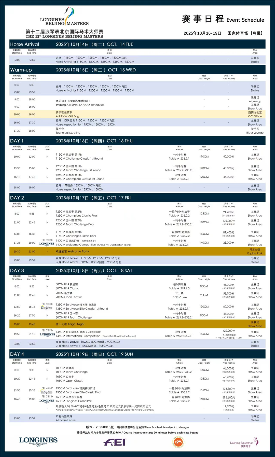 金秋十月,馭夢(mèng)歸來(lái),躍見(jiàn)傳奇 10月16日至19日 世界的目光將再次聚焦國(guó)家體育場(chǎng)(鳥(niǎo)巢) 第十二屆浪琴表北京國(guó)際馬術(shù)大師賽蓄勢(shì)待發(fā) 來(lái)自歐洲、美洲、亞洲的頂級(jí)騎手匯聚于此 與中國(guó)精英與新生代并肩競(jìng)躍 優(yōu)雅與速度共舞,精準(zhǔn)與力量輝映 一場(chǎng)匯聚全球焦點(diǎn)的馬術(shù)盛典,即將點(diǎn)燃! 自2011年首度落地鳥(niǎo)巢 浪琴表北京國(guó)際馬術(shù)大師賽迎來(lái)全新篇章 這里,是中國(guó)騎手與世界同場(chǎng)競(jìng)技的殿堂 也是觀眾近距離領(lǐng)略國(guó)際水準(zhǔn)的盛會(huì) 十二屆賽事耕耘,超百位世界冠頂尖騎手曾馳騁鳥(niǎo)巢,他們共斬獲17枚奧運(yùn)金牌。超過(guò)1,700名中國(guó)騎手登上這方舞臺(tái),觀眾總計(jì)突破36萬(wàn)人次。 歷經(jīng)沉淀與蛻變,浪琴表北京國(guó)際馬術(shù)大師賽早已超越競(jìng)技本身,它見(jiàn)證了中國(guó)馬術(shù)的成長(zhǎng),也讓世界看到了我們的舞臺(tái)。今日再啟,傳奇即將躍升新章! 今年大賽總獎(jiǎng)金 204萬(wàn)元人民幣,12位國(guó)際頂尖騎手強(qiáng)勢(shì)集結(jié),其中4位曾登頂世界第一。 世界馬術(shù)王者亨里克·馮·艾克曼(Henrik von Eckermann)、荷蘭名將哈里·斯莫爾德斯(Harrie Smolders)、德國(guó)戰(zhàn)車(chē)丹尼爾·杜瑟(Daniel Deusser)以及比利時(shí)傳奇雙子星代表奧利維爾·費(fèi)利佩爾茨(Olivier Philippaerts)與格雷戈里·瓦泰萊(Gregory Wathelet)等悉數(shù)到場(chǎng)。 中國(guó)陣容同樣星光熠熠,奧運(yùn)騎手李耀鋒、張興嘉,亞運(yùn)新銳陳雨辰領(lǐng)銜出戰(zhàn),兩屆浪琴表大獎(jiǎng)賽冠軍梁銳基等再度沖擊巔峰。 他們將代表中國(guó),與世界最強(qiáng)陣容同場(chǎng)較量,在鳥(niǎo)巢書(shū)寫(xiě)新的榮耀時(shí)刻。 10月16日|開(kāi)幕日 團(tuán)體賽燃情揭幕,年輕騎手率先登場(chǎng) 10月17日|決戰(zhàn)日 125CM冠軍賽與120CM團(tuán)體賽強(qiáng)勢(shì)對(duì)抗 10月18日|狂歡日 青少年賽、EuroHorse精英賽閃耀上演 夜幕下「騎士之夜」盛典開(kāi)啟 10月19日|巔峰日 壓軸登場(chǎng)——135CMEuroHorse決賽 與150CM浪琴表大獎(jiǎng)賽 巔峰對(duì)決,終定桂冠之主! 四天賽程、場(chǎng)場(chǎng)焦點(diǎn) 每一次躍起,都將是世界頂尖的較量 文末留下你最期待的騎手名字 截至10月17日晚18:00 點(diǎn)贊最高的前8名 我們將送出18日/19日 【馬術(shù)雜志嘉賓·專(zhuān)屬觀賽邀請(qǐng)函】 賽事期間,鳥(niǎo)巢將化身一座充滿活力的馬術(shù)生活空間 三大票區(qū),帶給你沉浸式觀賽體驗(yàn) 1 VIP坐席 尊享五星級(jí)餐飲、專(zhuān)屬伴手禮、核心高端禮遇 2 內(nèi)場(chǎng)坐席 近距離感受主賽場(chǎng)與熱身區(qū)雙重氛圍 3 看臺(tái)坐席 一覽全景,捕捉每一次完美躍越 這里匯聚運(yùn)動(dòng)、美食與生活方式 浪琴表以現(xiàn)代工藝詮釋經(jīng)典 展示功能與美學(xué)的合二為一 詮釋時(shí)空聯(lián)結(jié)的永恒詩(shī)意 保時(shí)捷展區(qū)詮釋馳騁精神 CT、CWD、EQUILINE、八尺龍、瑪尚、忻駿 小馬百寶屋展示人馬合一的優(yōu)雅 瑰麗酒店攜手桑干、西鳳酒、voss 戰(zhàn)馬、德京咖啡呈獻(xiàn)秋日臻味 SIGMA相機(jī)定格優(yōu)雅瞬間 鳥(niǎo)巢文創(chuàng)點(diǎn)亮紀(jì)念時(shí)刻 更有親子互動(dòng)、小馬體驗(yàn)、簽名合影與驚喜抽獎(jiǎng) 吉祥物星仔、星妹帶來(lái)歡樂(lè)陪伴 讓馬術(shù)精神延展為全家共享的生活美學(xué) 十二載征程,即將再啟新篇 10月16日至19日,讓我們相約鳥(niǎo)巢 共賞人馬合一的極致時(shí)刻 見(jiàn)證傳奇再躍、榮耀重燃 一起「躍見(jiàn)傳奇 Mastery in Motion」! “圖片來(lái)源于浪琴表北京國(guó)際馬術(shù)大師賽官方及網(wǎng)絡(luò)” 文末留下你最期待的騎手名字 截至10月17日晚18:00 點(diǎn)贊最高的前8名 我們將送出18日/19日 【馬術(shù)雜志嘉賓·專(zhuān)屬觀賽邀請(qǐng)函】 |