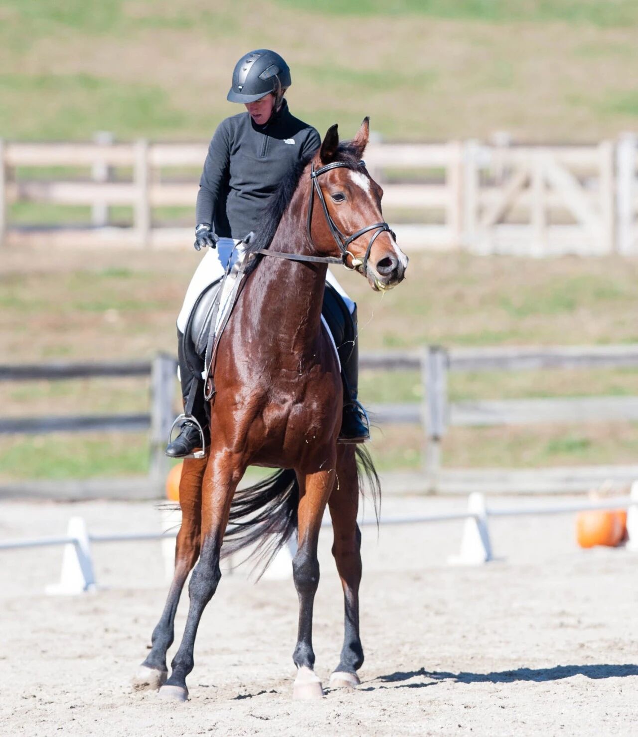 理解 “受驚” “受驚”(spooking)是馬匹天生的防御反應,它們在感知到潛在危險時,會本能地選擇逃避。這種反應是馬的生存機制,而非“固執(zhí)”或“不聽話”。但如果在訓練時這種反應頻繁出現(xiàn),就會影響訓練效率,甚至危及騎手安全。 在應對“受驚馬”時,我們首先要分清兩種情況的馬匹: 真正害怕的馬 因為外部刺激過強或缺乏安全感而產(chǎn)生恐懼 逃避工作的馬 通過過去被“安撫”或“停下來”的經(jīng)驗,學會利用受驚逃避工作 兩者的訓練思路不同,但核心目標一致:讓馬學會在工作中保持放松(relaxation),并將放松視為安全的狀態(tài)。 分辨“放松”與“疲勞” 放松不是“累到不動”。疲勞的馬可能表現(xiàn)出順從,但它的身體和心理的狀態(tài)仍然很緊繃。真正放松的馬,會在步伐中展現(xiàn)出有律動的節(jié)奏、伸展的體態(tài)和均衡的呼吸。而一味“操到精疲力竭”的訓練,只會讓恢復更慢、風險更高。訓練的終點應是“狀態(tài)平靜”,而非“體力耗盡”。 放松不是偶然發(fā)生的,它是一項可訓練的能力。騎手需要有計劃地重復、強化這種狀態(tài),讓馬把“放松”當作對外界刺激的默認反應。只有當馬能在陌生環(huán)境中自如應對、信任騎手、保持專注,真正的訓練成果才會在這時展現(xiàn)。 騎手的心理與身體 馬對騎手的情緒極其敏感。所以騎手的冷靜其實是最好的引導。如果騎手在接近“危險區(qū)域”時先行緊張,手僵、腿僵、呼吸急促,馬會立刻察覺并加強警惕。因此,控制騎手自己的反應,是一切訓練的起點。 保持平穩(wěn)的呼吸、穩(wěn)定的坐姿、柔和的韁繩接觸,向馬傳遞“沒什么大不了”的信號。當馬受驚時,不要拍它表示鼓勵、也不要停下,而是繼續(xù)前行——哪怕只是慢步。這樣馬會逐漸明白:受驚不會帶來獎勵或停頓,繼續(xù)向前才是安全的。 關鍵策略 用工作“分散注意力”:讓大腦有事可做 讓馬集中注意力,是緩解受驚的關鍵策略。當馬對某個角落或某些聲音感到害怕時,不要強迫它正面面對,也不要用暴力手段逼迫。相反,可以讓馬做一個肩內(nèi)(shoulder-in)或偏橫步(leg-yield)經(jīng)過那個區(qū)域。通過改變彎度與外側(cè)韁的控制,馬的注意力會重新回到騎手身上,減少對外界刺激的注意。這些小動作不僅能重建連接,還能在馬的心里建立一種“有事可做”的節(jié)奏,取代恐懼時的混亂感。