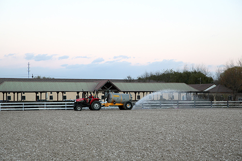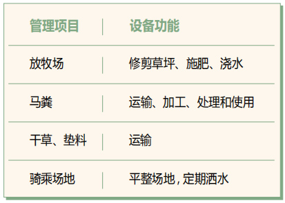 上一期介紹了馬糞存放區(qū)和干草、墊料長(zhǎng)期存放區(qū),本期將介紹馬術(shù)俱樂(lè)部布局元素:設(shè)備及其存放區(qū)。 與其他和農(nóng)業(yè)相關(guān)的公司相比,馬術(shù)俱樂(lè)部需要的設(shè)備種類相對(duì)較少。俱樂(lè)部的各項(xiàng)工作,有小型拖拉機(jī)或是大型園藝拖拉機(jī)(garden tractor)就能起到很多作用,如放牧場(chǎng)和馬糞的管理;墊料、干草的運(yùn)輸;場(chǎng)地的維護(hù)。放牧場(chǎng)和馬糞的管理工作也可以外包,不用等拖拉機(jī)的配件齊全后再做。右邊的表格就放牧場(chǎng)、馬糞、干草、墊料及騎乘場(chǎng)地的管理所需要的一些功能大致列出,可根據(jù)需求配備。 以天星調(diào)良國(guó)際馬術(shù)俱樂(lè)部新近升級(jí)的國(guó)際標(biāo)準(zhǔn)場(chǎng)地為例,天星調(diào)良馬術(shù)在進(jìn)口場(chǎng)地建設(shè)材料的同時(shí),引進(jìn)了所有的場(chǎng)地維護(hù)設(shè)備,如壓平機(jī)(roller),平地機(jī)(chain leveller)和灑水車(water tank)。所有設(shè)備的一次性到位,也是希望可以良好地維護(hù)場(chǎng)地,為日常教學(xué)、訓(xùn)練和競(jìng)賽提供國(guó)際一流場(chǎng)地,同時(shí)延長(zhǎng)場(chǎng)地使用壽命。天星調(diào)良馬術(shù)升級(jí)后的場(chǎng)地,從馬匹的步幅、馬匹用力和起跳的感覺(jué)讓人馬騎乘得更有信心,發(fā)揮得更好,而且對(duì)馬匹肢蹄的保護(hù)具有重大意義,也是天星調(diào)良馬術(shù)對(duì)俱樂(lè)部競(jìng)賽馬、馬主馬、教學(xué)馬馬匹福利的又一次大升級(jí)。 天星調(diào)良馬術(shù)升級(jí)后的場(chǎng)地,從馬匹的步幅、馬匹用力和起跳的感覺(jué)讓人馬騎乘得更有信心,發(fā)揮得更好,而且對(duì)馬匹肢蹄的保護(hù)具有重大意義,也是天星調(diào)良馬術(shù)對(duì)俱樂(lè)部競(jìng)賽馬、馬主馬、教學(xué)馬馬匹福利的又一次大升級(jí)。 如上面提到的拖拉機(jī)等,最好是可以有固定的存放區(qū),而且是有頂棚或在房子里,一方面保障設(shè)備的安全和延長(zhǎng)相關(guān)設(shè)備的使用壽命,同時(shí)也能保持設(shè)備干凈整潔的外觀。如果俱樂(lè)部有自己的運(yùn)馬車,也需要固定的車位,不會(huì)影響其他車輛的日常通行。 馬匹的日常管理需要大量的人力,每天清理馬廄、護(hù)理馬匹、打掃馬房、運(yùn)輸馬糞等工作需要各種工具,這些清掃工具(如鐵鍬、篩子、掃帚等)需要在馬房的專區(qū)存放,不適合放在辦公室和休息區(qū)。 |