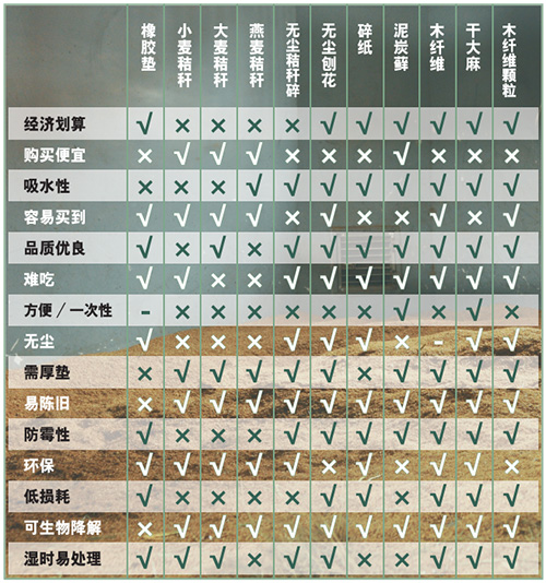 四個簡單的步驟就能以最低的成本還你一個干凈的馬房。 哪種墊料是最好的? 現(xiàn)在你知道如何有效利用馬房鋪墊,但你是否使用的是最合適的墊料呢?有這么多不同類型的墊料供應(yīng),如何選擇最好的材料的確很難。你需要考慮很多因素,然后再做出決定。 你的馬有呼吸道疾病嗎? 如果有,你就需要選擇無塵的墊料。 你的馬老吃鋪墊嗎? 如果是這樣,用一些它不愛吃的材料以避免浪費。 你的預(yù)算緊張嗎? 如果你只擔(dān)心錢不夠,就選擇更省錢的方式。但是記住,即使一張橡膠墊看起來似乎很貴,長遠(yuǎn)看來它卻是相當(dāng)經(jīng)濟(jì)實用的。 想要環(huán)保? 如果你在尋找較為環(huán)保的墊料,這里有一些不錯的選擇。 你有多大的儲存空間? 如果你正計劃批發(fā),那么選擇貯藏時不易發(fā)霉的材料。 當(dāng)你確定以上問題的答案,接下來看看下面的表格,你一定能做出最滿足你和馬需求的選擇。 |