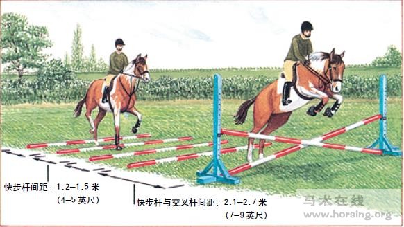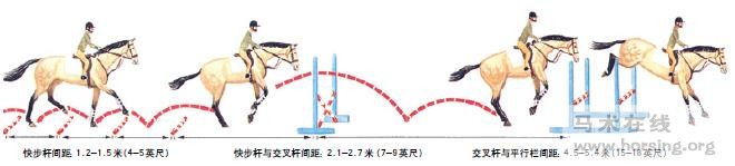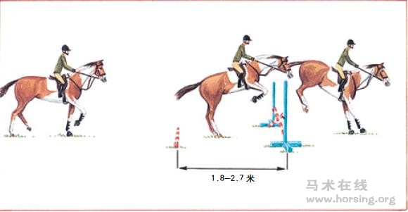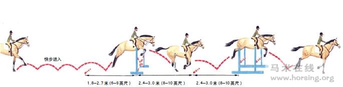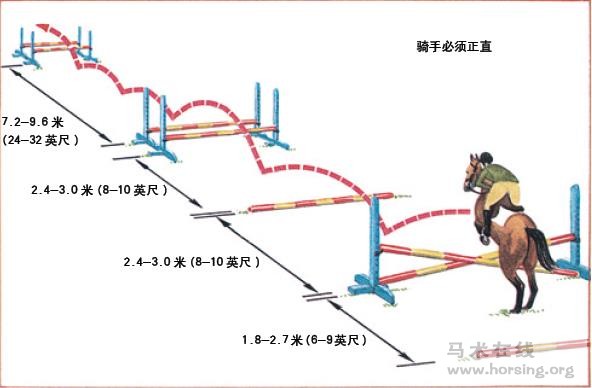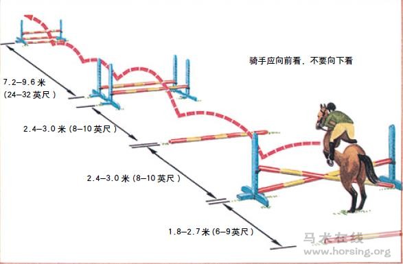 介紹復(fù)合障礙 在要求一匹馬跳越一道復(fù)合障礙前,應(yīng)當(dāng)讓馬熟悉放在一個(gè)簡(jiǎn)單障礙前的地桿的位置。這個(gè)快步桿(用快步接近)有助于馬匹在正確的位置起跳。如果馬匹不明白如何應(yīng)對(duì)這個(gè)地桿,那么對(duì)以后的一些復(fù)合障礙的練習(xí)就會(huì)造成不利的影響。 快步桿應(yīng)該放在距交叉桿1.8-2.7 米遠(yuǎn)的位置,這將意味著馬匹應(yīng)當(dāng)跨過地桿后再跳越障礙。如果馬匹快步越過地桿,那它就不能很好地越過障礙。 在接近障礙時(shí),騎手必須全神貫注地保持馬匹平衡、正直、有節(jié)奏地向前運(yùn)動(dòng),兩腿緊貼于馬的肋側(cè),當(dāng)馬到達(dá)地桿時(shí)兩腿向內(nèi)靠壓鼓勵(lì)馬去跳越。在最后時(shí)刻騎手萬(wàn)萬(wàn)不可改變姿勢(shì)或推進(jìn)馬匹伸展背腰跳越。時(shí)刻牢記跳越障礙時(shí)是馬在跳越而不是騎手在跳越,不要試圖用你的身體去影響馬的跳越。 設(shè)置一個(gè)交叉桿的目的是使馬匹能從障礙的中間跳過。馬匹總是能從中間跳越障礙很重要,這也取決于騎手正確的引導(dǎo)。 當(dāng)馬匹能熟練地應(yīng)對(duì)這一訓(xùn)練時(shí),交叉桿障礙可以改為垂直桿,距地面30-60 厘米,這是鼓勵(lì)馬匹用飛節(jié)跳越的一個(gè)有效方法,并可幫助騎手感覺節(jié)奏和平衡。 快步地桿到交叉桿 在交叉桿前面放置3-4 個(gè)快步桿,間距為1.2-1.5米,最后一個(gè)桿與交叉桿之間的距離應(yīng)為2.1-2.7米。這個(gè)練習(xí)非常有助于讓騎手在跳越前保持節(jié)奏和平衡。如果騎手試圖通過推進(jìn)馬匹進(jìn)入障礙而使馬的平衡或節(jié)奏發(fā)生改變,馬匹就不能做這個(gè)練習(xí)。在最后一個(gè)桿和障礙之間有一步快步的空間,但是如果馬匹失去了節(jié)奏和平衡,就不能夠留出那一步的空間。騎手上身的任何運(yùn)動(dòng)都會(huì)影響馬匹,這實(shí)際上是對(duì)騎手騎姿動(dòng)作的一個(gè)測(cè)試。 知道了快步保持平衡和節(jié)奏的那種好的感覺后,再結(jié)合向前的運(yùn)動(dòng),在跑步接近障礙時(shí)也同樣能做到。有人經(jīng)常會(huì)看到一些騎手在跳越時(shí)對(duì)他們的馬匹大聲叫喊,這樣在最后的幾步馬匹就會(huì)加大步伐而失去平衡,在這個(gè)時(shí)候保持節(jié)奏、平衡、推進(jìn)力和騎手的姿勢(shì)同樣是非常重要的。 騎手應(yīng)用輕快步接近障礙做這個(gè)練習(xí),上身從髖部以上略向前傾,為最后跳越做好準(zhǔn)備。騎手應(yīng)看著第一個(gè)桿直到在馬耳的下方消失,然后看著障礙,感覺同樣的快步節(jié)奏跨越全部地桿和跳越障礙。重要的是騎手決不能先于馬提前做出跳越的動(dòng)作,這個(gè)練習(xí)將會(huì)證實(shí)這樣做是錯(cuò)誤的。 交叉桿到平行雙橫木 這是最簡(jiǎn)單的一種復(fù)合障礙,是在快步桿到交叉桿的基礎(chǔ)上,在距交叉桿2.4-3.0 米處加放一個(gè)地桿,再在距此地桿2.4-3.0 米處放置一個(gè)小的平行欄。這種復(fù)合障礙的作用是訓(xùn)練馬匹有一個(gè)良好的跳越技術(shù)??觳綏U和交叉桿可使馬匹跳越進(jìn)入到平行欄的正確起跳位置。為了越過這個(gè)寬障礙而又不觸及前桿,馬必須抬高前肢和肩部并向后收起前肢。這時(shí)馬匹決不能因騎手的控制限制它后肢的運(yùn)動(dòng),而后肢要抬起向后伸。 讓一匹新馬做這個(gè)訓(xùn)練應(yīng)用小的障礙,但對(duì)一匹馬很有經(jīng)驗(yàn)的成年馬障礙可按要求設(shè)置。這對(duì)任何標(biāo)準(zhǔn)的馬匹都是一個(gè)有用的練習(xí),同時(shí)對(duì)騎手也是一個(gè)很好的測(cè)試。 騎手必須能始終保持它的姿勢(shì),保持重心在腳跟,坐穩(wěn),抬頭目視前方,肩部不能趴在馬匹頸部上方,必須允許馬匹充分使用它的頭和頸跳越。 騎手應(yīng)用一個(gè)平衡、有節(jié)奏的快步前進(jìn)接近障礙,保持兩腿緊貼于馬的肋側(cè),但允許馬去跳越。騎手必須讓馬匹在他的控制下跳越,但也不能因上身過早或過度的前傾給馬的肩部增加壓力。當(dāng)你騎馬離開復(fù)合障礙時(shí),你要確保立即恢復(fù)節(jié)奏。 快步地桿到交叉桿到平行雙橫木 這是上一個(gè)復(fù)合障礙的一種變化形式,在障礙前有4 個(gè)快步桿,最后一個(gè)桿距交叉桿2.1-2.7米遠(yuǎn),然后距交叉桿4.5-5.4 米遠(yuǎn)處是一個(gè)平行桿。因?yàn)樵诮徊鏃U與平行欄之間的距離比較長(zhǎng),在中間不需要放置地桿。 這兩種復(fù)合欄的不同之處是,在這個(gè)復(fù)合欄由于地桿的作用馬匹更能平衡到達(dá)起跳位置,騎手也必須平穩(wěn)騎坐,而在前一個(gè)復(fù)合欄卻需要騎手移動(dòng)上身鼓勵(lì)馬匹跳越第一個(gè)桿。 在這個(gè)練習(xí)中,上身的任何動(dòng)作都將會(huì)影響馬匹跨越最初幾個(gè)桿。 在整個(gè)練習(xí)中,騎手身體的動(dòng)作做到最小的程度是很重要的。騎手必須在允許馬匹跳越的同時(shí)上身從髖部以上向外前傾(但不能太向前傾),然后保持這種姿勢(shì)直到練習(xí)結(jié)束。如果在跳第一個(gè)欄時(shí)騎手上身過度前傾,那他在跳越第二個(gè)桿前就不得不將上身挺起,這種額外的動(dòng)作會(huì)使馬匹失去平衡,可能引起馬匹碰撞第二個(gè)欄。這個(gè)訓(xùn)練時(shí)騎手學(xué)習(xí)盡可能平穩(wěn)騎坐的一