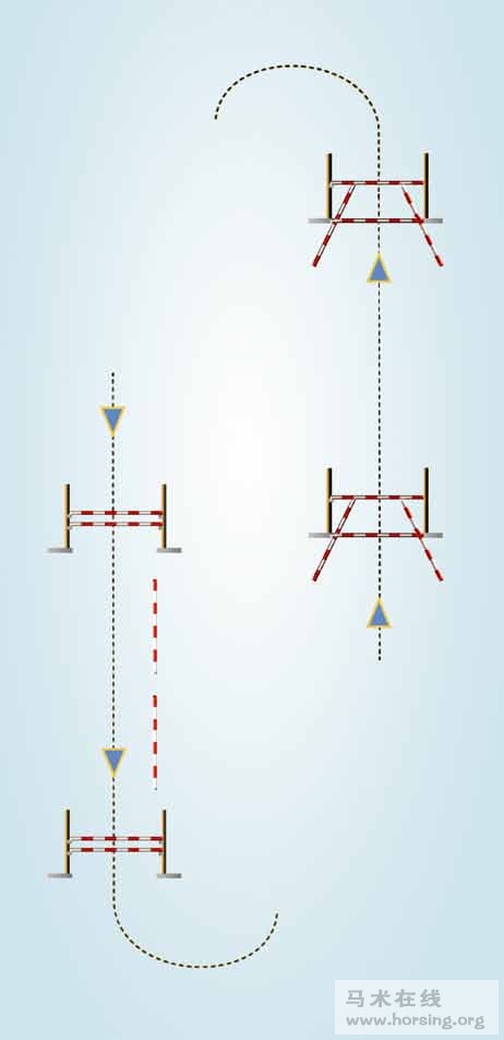 "關(guān)系障礙和組合障礙并非是難以逾越的挑戰(zhàn)。" 首先,不論你是騎手還是教練,為了在訓(xùn)練中順利學(xué)習(xí)跳躍關(guān)系障礙及組合障礙的技巧,必須要知道所策騎馬匹的步幅長度。多觀察馬匹的平地訓(xùn)練,評估它的步幅長短,并切記馬匹在跳躍障礙時(shí)的步幅會變得比在平地工作時(shí)略長些。障礙訓(xùn)練中,跑步的質(zhì)量是至關(guān)重要的,所以值得在平地上多花時(shí)間訓(xùn)練以獲得良好的跑步節(jié)奏。 馬匹在兩個(gè)障礙間的步幅長度受多個(gè)因素的影響。例如,不管是在室內(nèi)或室外訓(xùn)練場地,松軟或堅(jiān)硬的地面都會對馬匹的步幅帶來不同的影響。而在一定程度上,障礙高度也屬于影響因素之一。 訓(xùn)練要從稍低于比賽用障礙的高度開始。例如,通常在兩個(gè)障礙之間的步幅距離是24 英尺(約為7.32 米),但在訓(xùn)練中可以設(shè)置為23 英尺(約為7 米)。對于較小的馬以及步幅短的馬,也可以設(shè)置為22 英尺(約為6.7 米),這樣會讓馬匹在跨越組合障礙時(shí)輕松些。當(dāng)馬變得更自信時(shí),試著將障礙擺開一些,但如果感覺距離過大,要立即調(diào)整回來。 準(zhǔn)備和評估 確保馬匹經(jīng)過熱身后再進(jìn)入障礙訓(xùn)練,馬匹要有前進(jìn)氣勢,時(shí)刻聽從騎手的指令,穩(wěn)定且服從。如果馬的步幅小,可沿訓(xùn)練場地一側(cè)的長邊多做伸長步幅的練習(xí)——但不要加快步伐的節(jié)奏——如果必要,可以在進(jìn)入障礙線的最后三步時(shí)再加快。馬匹應(yīng)能夠做出越來越有力、而不是長而平的步伐。要體會到馬帶著你接近障礙的感覺,而不是你在催促并強(qiáng)迫它去接近障礙。 從交叉桿和小型的垂直障礙開始,確保馬匹始終專注于跨越障礙本身。相對于較為機(jī)敏的馬而言,略顯遲鈍、缺乏前進(jìn)動(dòng)力或注意力分散的馬可能需要跳更多的障礙來做準(zhǔn)備,而且要特別注意它是否從障礙的正中越過且保持正直。 對于組合障礙來說,保持正直是非常重要的——如果馬總是偏移,無法保持正直,無疑會打亂你的既定路線,讓預(yù)計(jì)的距離出現(xiàn)偏差。如果進(jìn)入下一道障礙的路線需要轉(zhuǎn)彎,也可能導(dǎo)致馬匹偏移或失去平衡。為了糾正馬匹的偏移,可以在起跳時(shí)稍微抬起反向手——比如它向左偏,你就稍抬起右手。 關(guān)系障礙 請回想你在進(jìn)入關(guān)系障礙中第一道障礙桿的最后幾步。 如果距預(yù)計(jì)起跳點(diǎn)過近,馬可能會墊一小步,而不是真正的起跳。它的實(shí)際起跳點(diǎn)過遠(yuǎn),導(dǎo)致落地點(diǎn)非常臨近該道障礙,使得距離下一道障礙桿的路線變長。 有效地通過關(guān)系障礙和組合障礙需要依靠馬匹強(qiáng)有力的步伐而不是速度,并且注意時(shí)刻保持與馬的聯(lián)系。在馬匹起跳時(shí),手盡量不要抬起,因?yàn)檫@樣會破壞它的平衡。 48 英尺(約14.6m )的三步距離將會是一個(gè)很好的訓(xùn)練,你可以利用這個(gè)距離來練習(xí)伸長和縮短馬的步幅。這個(gè)距離可以做三個(gè)大步幅或者四個(gè)小步幅——相較于先做出三個(gè)大的步幅然后練習(xí)逐漸收縮,馬更容易接受先由四個(gè)小步幅開始,再逐漸伸長的訓(xùn)練。 騎手在著陸時(shí)的姿勢和動(dòng)作將影響馬匹在兩道障礙桿之間的行為。為了爭取更大的步幅空間,在經(jīng)過組合障礙的第一道障礙桿之后,你應(yīng)該坐起來并控制好馬匹,力求做到四個(gè)一致的步幅,而不是三大步及一個(gè)墊步。 在做三個(gè)大的步幅時(shí),不要試圖沖過第一道障礙,而是要力圖做到良好的起跳。在著陸之后可以增加動(dòng)力,但不要給的過多,以免馬匹沖撞接下來的第二道障礙。 作為第一道的雙橫木障礙往往有助于讓你輕松應(yīng)對第二道的垂直障礙,但練習(xí)時(shí)要從難度低的障礙開始。你可以逐步擴(kuò)展第二道障礙——改建成一道雙橫木障礙或增加填充物。 你也可以增加第一道障礙的跨度,但切記馬在越過跨度較大的雙橫木障礙之后,它的落地點(diǎn)也會非常臨近此道障礙,從而導(dǎo)致你更難把握之后的行進(jìn)距離,所以在增加第一道障礙的跨度時(shí)要適度。 組合障礙 馬匹在前兩道障礙中獲得自信后,你就可以添加第三道障礙并開始組合障礙的練習(xí)了。兩步的障礙間距比一步更容易,因?yàn)樗o騎手提供了更多的思考時(shí)間和調(diào)整空間——特別是當(dāng)馬匹采用較短步幅時(shí)。然后如圖所示,你可以晉級練習(xí)一步的障礙間距。在接近第一道障礙時(shí)保持專注,當(dāng)馬著陸時(shí)再判斷下兩道障礙的行進(jìn)方式??缭秸系K的時(shí)候,別讓自己的重心過于靠前,這可能會導(dǎo)致馬匹跳得太平并打桿。 在組合障礙中,騎手在跨越第二道障礙時(shí)的騎姿是至關(guān)重要的。騎手很容易嘗試增加馬匹動(dòng)力卻導(dǎo)致它騰空時(shí)跳得太平,所以在接近最后一道組合障礙的時(shí)候,應(yīng)該在增加動(dòng)力前坐起身來。 而重要的是別擔(dān)心第二、三道障礙間的路線,因?yàn)橹挥挟?dāng)馬越過第一道障礙并已著陸時(shí),才能考慮下一道障礙。 如果馬的著陸點(diǎn)過近,你可以增加它的動(dòng)力;如果它跳得有些過了,著陸點(diǎn)遠(yuǎn)了,你可以坐起身來并收縮它的步伐。 偏離路