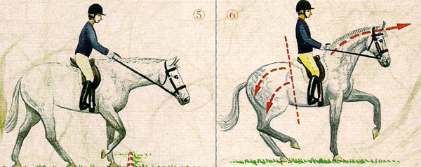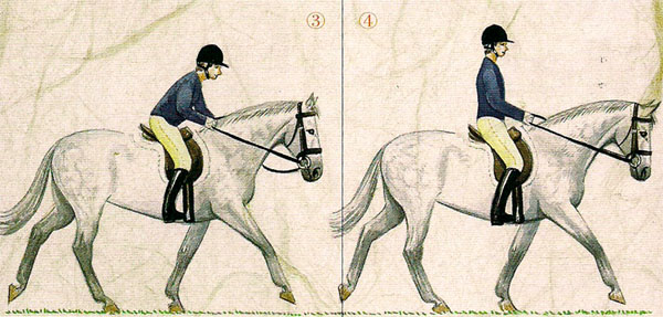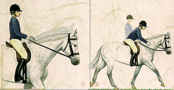 大多數(shù)騎手發(fā)現(xiàn)很難做到正確的韁接觸。下面的方法會幫你通過韁與馬匹嘴部和馬的接觸進行很好的溝通。 讓馬匹通過要韁來牽動你的手,同時讓你的手“想要向前”,且朝向馬嘴的方向,而不要讓你的手企圖向后朝你的髖部移動。這是鼓勵馬匹更多地伸展脊椎,更加向前去尋找口銜。馬匹的頭、頸、背越放松,呼吸就會變得更有效率,并且會更加容易地接受你要求它做的動作。 要讓你的手隨著馬匹頭部的前后運動而前后運動,這樣馬的脖子可以伸長并流暢運動,而不是緊張、抗拒。用這種很輕的接觸,你會感覺到馬的嘴部是很柔軟的。過一段時間后,如果你不去跟馬匹較勁,它將把口銜向前要,這是馬匹工作受銜的第一階段,也是讓馬匹身體正直的先決條件。 要尋求手部的敏感意識,想象你的手里握著兩只小鳥(如圖),你想輕輕地、安全地握著它們,當然你肯定不想把它們捏死。 要不停地檢查自己的姿勢感覺你的脖子是否自由,你的肩膀是否放松,你的胳膊肘是否放松并且下垂,你的肘部不要靠在肋骨上鎖定住,要讓它稍微向外一點。想象你的雙手手腕內(nèi)側(cè)有光束照耀著彼此,這會幫你保持手部握韁姿勢的端正:手掌是放松的,指尖接觸手掌心。 ①最初自由韁慢步,觀察馬匹想把頭放在什么位置,注意馬匹的頭部是如何前后運動的。 ②騎手身體向前,在馬匹脖子的兩側(cè)撫摸輕拍,左韁接觸時,你可以拍馬匹脖子右側(cè)。如果馬匹不向前尋找口銜,那么它會縮短脖子。 ③用右韁接觸馬匹。撫摸馬匹脖頸左側(cè),看看馬匹是否仍然向前尋找口銜。 ④現(xiàn)在握好韁繩,讓它頭部自如、敏感地隨著它運動,它將會尋找口銜,并傳到你手上。 如果馬匹伸長脖子下部的肌肉,從你手中要更多的韁,不用擔(dān)心(圖5)。要讓馬匹的整個脊椎充分伸展開,才能最終使馬匹達到收縮。只有使馬匹的整個軀體更伸展,它的軀體才更有力量,才能做更多的高級動作(圖6)。 文/Joni Bentley,圖/Carole Vincer,譯/天星調(diào)良國際馬術(shù)俱樂部教練組 |