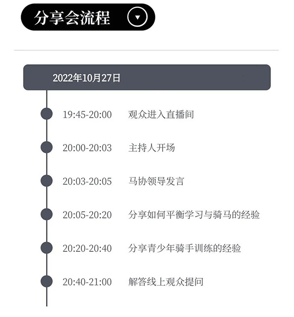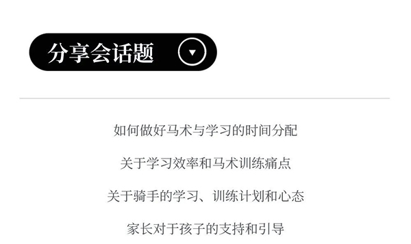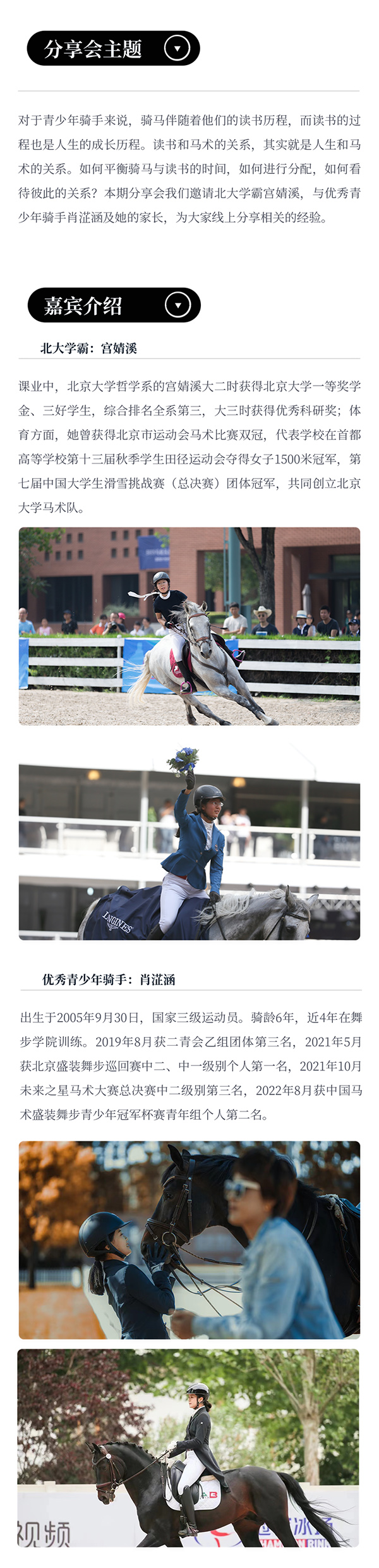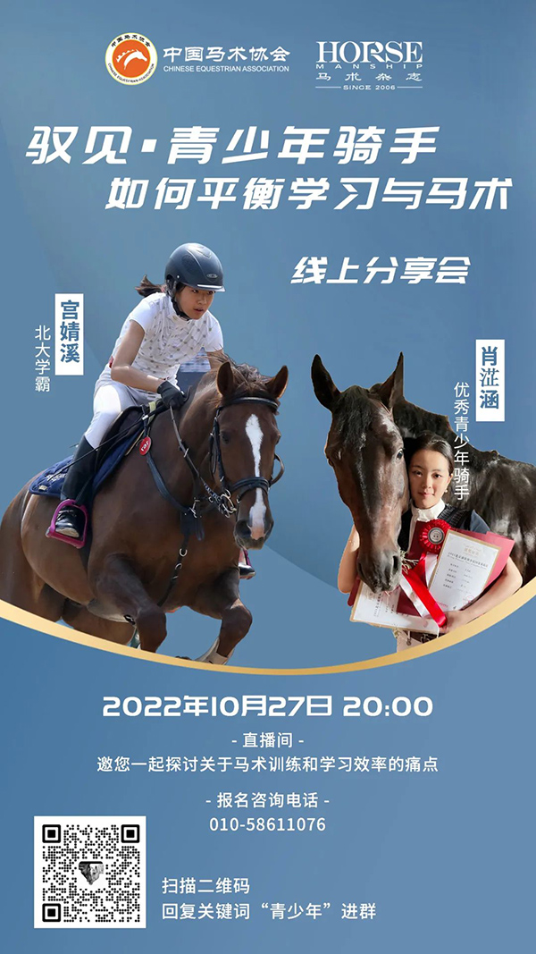 分享會(huì)主辦 中國(guó)馬術(shù)協(xié)會(huì)官網(wǎng) 分享會(huì)策劃 中國(guó)馬術(shù)協(xié)會(huì)媒信部 《馬術(shù)》雜志 分享會(huì)主題 馭見(jiàn)·青少年騎手如何平衡學(xué)習(xí)與馬術(shù)主題線上分享會(huì) 分享會(huì)嘉賓 青少年騎手:宮婧溪、肖淽涵 家長(zhǎng):肖淽涵母親張禾 分享會(huì)主持人 龐博 分享會(huì)時(shí)間 10月27日(周四)20:00-21:00 報(bào)名渠道 掃碼添加“馬術(shù)在線”微信 回復(fù)關(guān)鍵詞“青少年”進(jìn)群 |