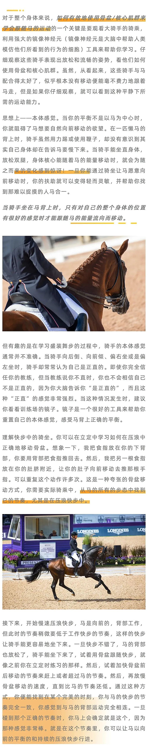 盛裝舞步騎手可能需要練習(xí)數(shù)千個(gè)小時(shí),通常是連續(xù)幾十年的時(shí)間,才能達(dá)到與馬完全和諧的那幾個(gè)瞬間。和諧就是當(dāng)馬在平衡中時(shí),它的動(dòng)作毫不費(fèi)力,富有力量,流暢而有彈性,而騎手則完全跟隨它的這種平衡和力量。 我想告訴你如何將自己的身體與馬結(jié)合在一起,這樣你就能感受到平衡、和諧。這通常是一個(gè)長(zhǎng)期且困難的過(guò)程。對(duì)騎手來(lái)說(shuō),壓浪練習(xí)是極具有挑戰(zhàn)性,我們?cè)谶@里重點(diǎn)講解。 文/JANE KAROL、ANNIE MORRIS 編譯/劉麗娜 |